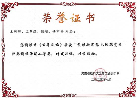 近日,河南省教科文卫体工会发布了“阅读新思想 永远跟党走”经典诵读活动获奖作品通报,我校选送教职工参赛作品荣获2项奖励。其中,第二附属医院王娜娜、孟苏煜、侯超、任京科的作品《百年交响》荣获二等奖、外语学院高俊丽的作品《青春中国》荣获三等奖。