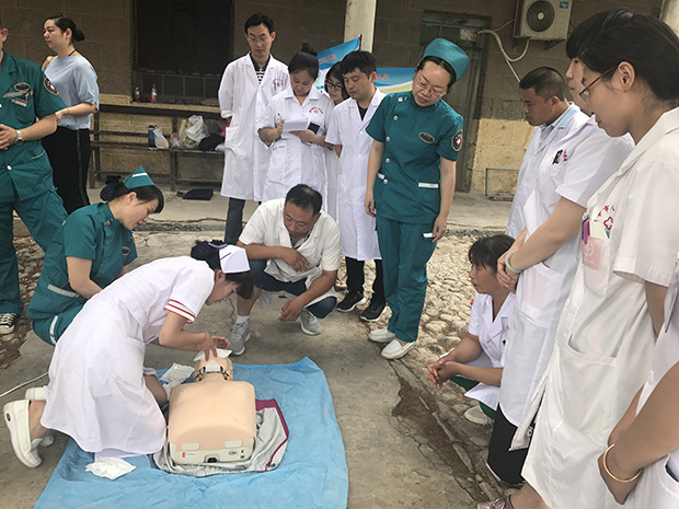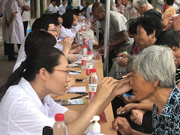 义诊现场,来自第一附属医院和第三附属医院神经内科、骨科、眼科、内分泌、急诊、中医、神经内科、创伤外科和疼痛科等多个科室的20多位医学专家认真为村民进行体格检查、仔细询问病情病史、耐心解答患者疑问,系统地讲解相关疾病的预防知识,指导他们科学饮食。同时急诊科的专家还为乡村医生开展了急救知识培训,专业技术人员为村民免费测血糖、做心电图、B超和X光等检查。