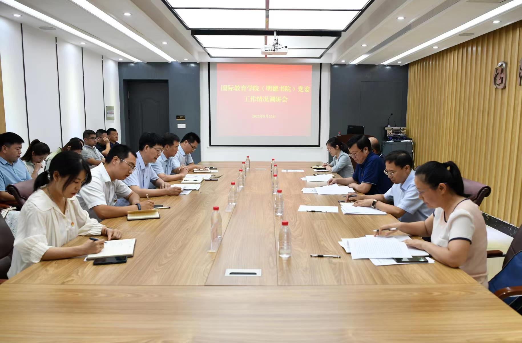 会议伊始,王正晓书记代表领导班子就学院党委工作从基本情况、工作开展情况、存在的问题三个方面向调研组做了汇报,重点汇报了党委运行及班子成员作用发挥、二级学院议事规则落实、干部选任及培养、巡视整改等事项。王玉安院长从发展定位、发展思路、发展瓶颈三个方面向调研组汇报了国际教育学院、明德书院建设发展情况。