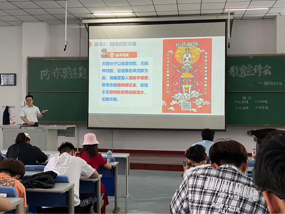 5月8日上午,我院邀请学校保卫处副处长徐红彦在三教楼D3教室,就预防电信网络诈骗为师生进行专题培训,学院团总支书记吕玉娟、辅导员宋卫锋和400余名同学参加了培训。
