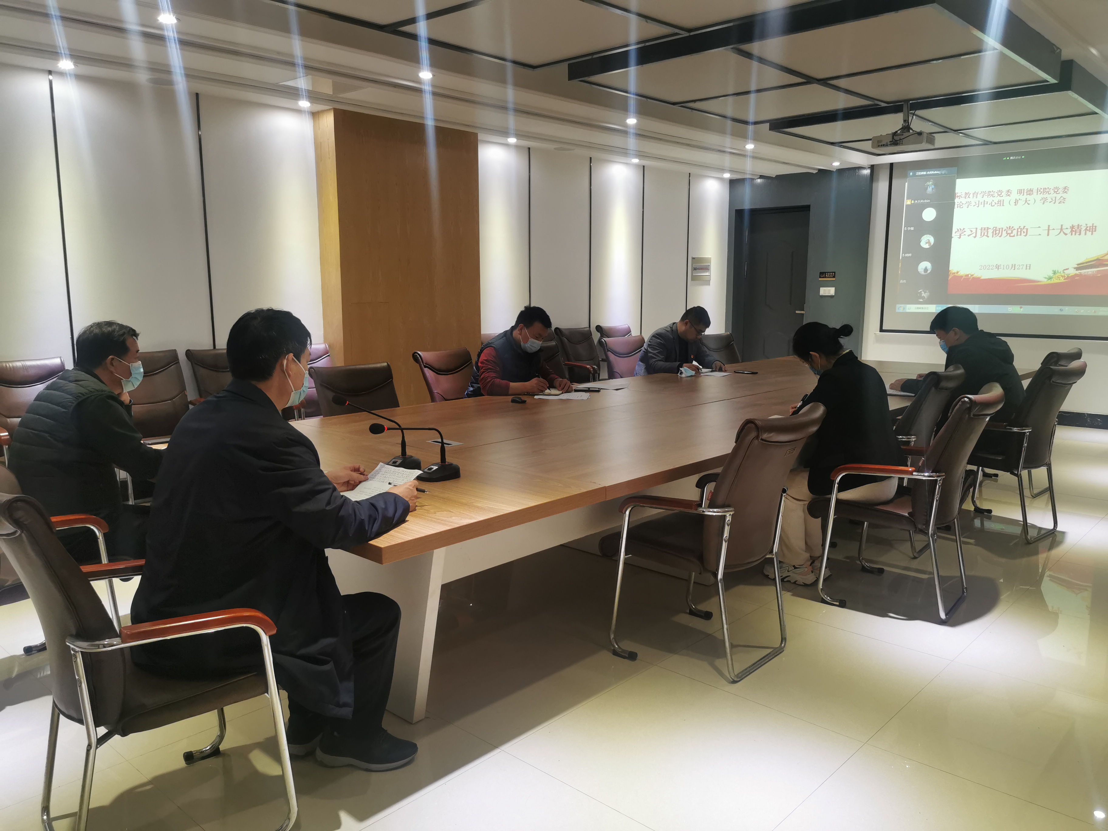 10月27日下午,国际教育学院、明德书院召开党委理论学习中心组(扩大)学习会,传达学习党的二十大精神,安排系统贯彻落实工作。会议由党委书记王正晓主持,王玉安院长及北校区值班同志在现场学习,其他校区值班值守干部职工及校外同志通过网络进行了学习。