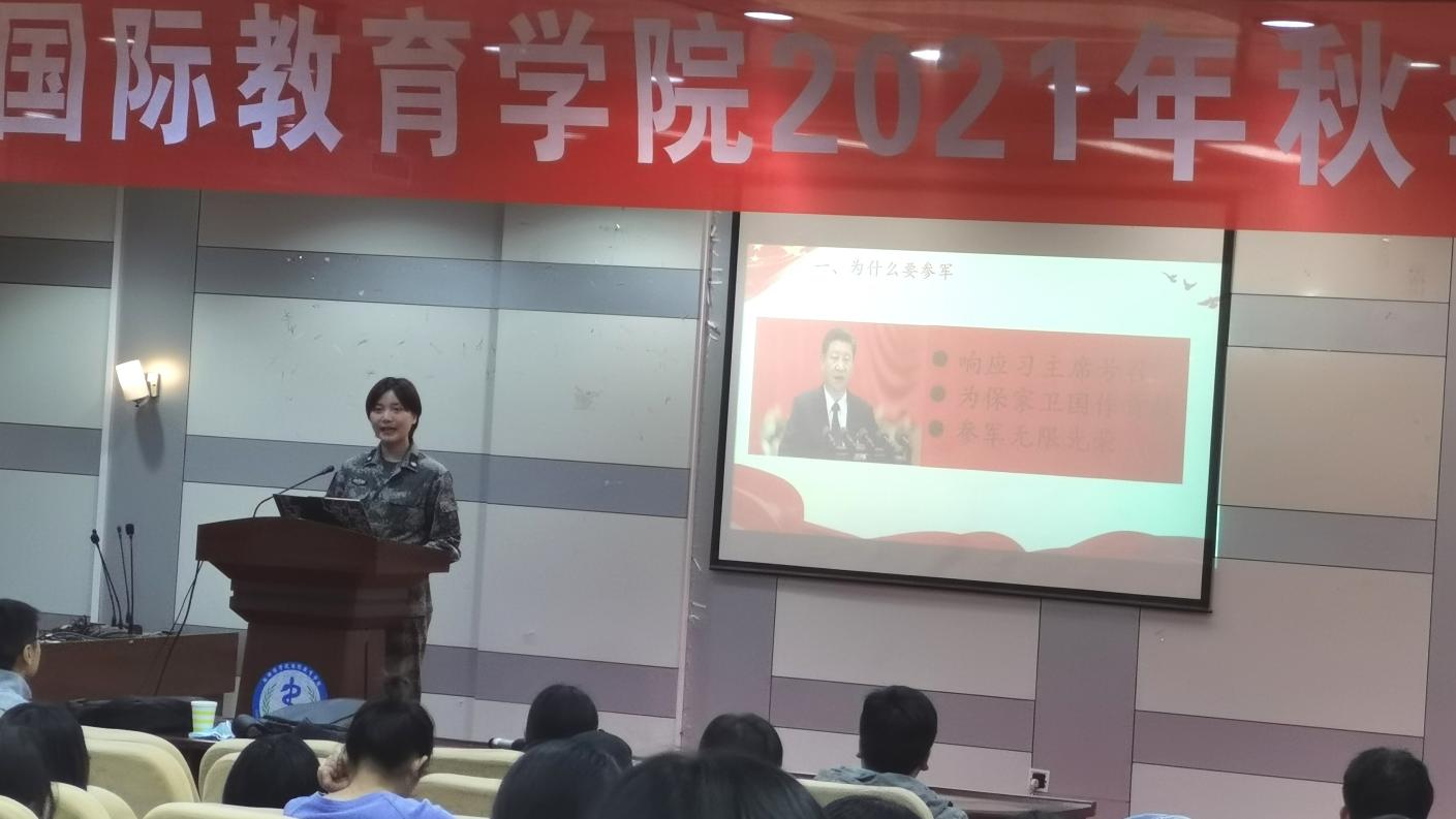 接着学院退役复学大学生关春亚结合自己入伍的经历和感受,向大家介绍了学校的入伍相关政策以及自己在部队的成长收获。