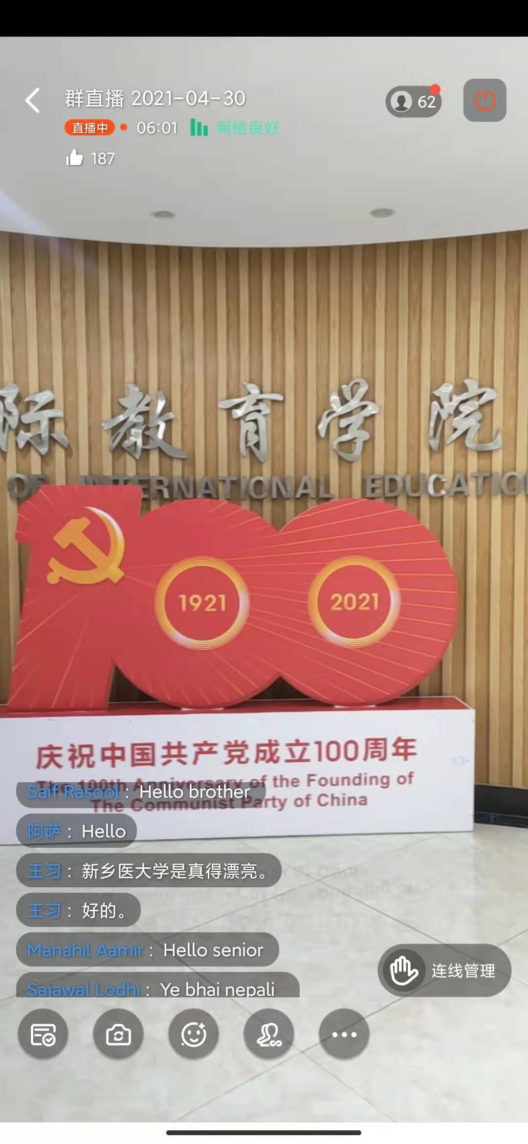 为积极响应国际教育学院“三服务三提升”活动宗旨,服务学生发展,进一步提升我院国际学生人才培养质量。4月30日上午,国际教育学院留学生辅导员以及留学生代表,通过钉钉平台,以视频直播方式,举办了以“连线新医——新生线上交流会”为主题的视频直播活动,与留学生在线互动。今年我院共有2020级国际学生84人,由于疫情无法到中国学习,本次活动旨在促进2020级新生了解校园,让他们身处国外也能够融入到校园文化中。
