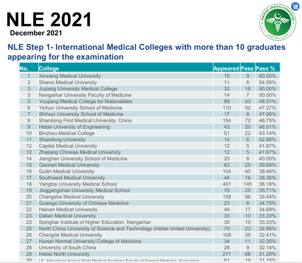 近日,巴基斯坦医学委员会传来喜讯,根据《2021年巴基斯坦国家医师资格综合笔试国际院校名单通过率》的成绩分析报告显示,我校2015级临床医学专业毕业国际学生在2021年巴基斯坦医师资格考试中取得佳绩。