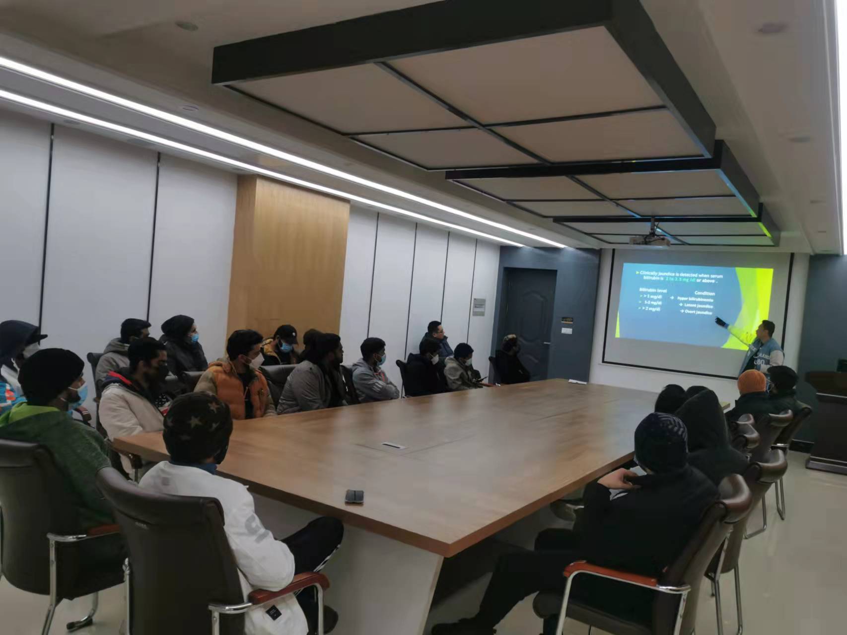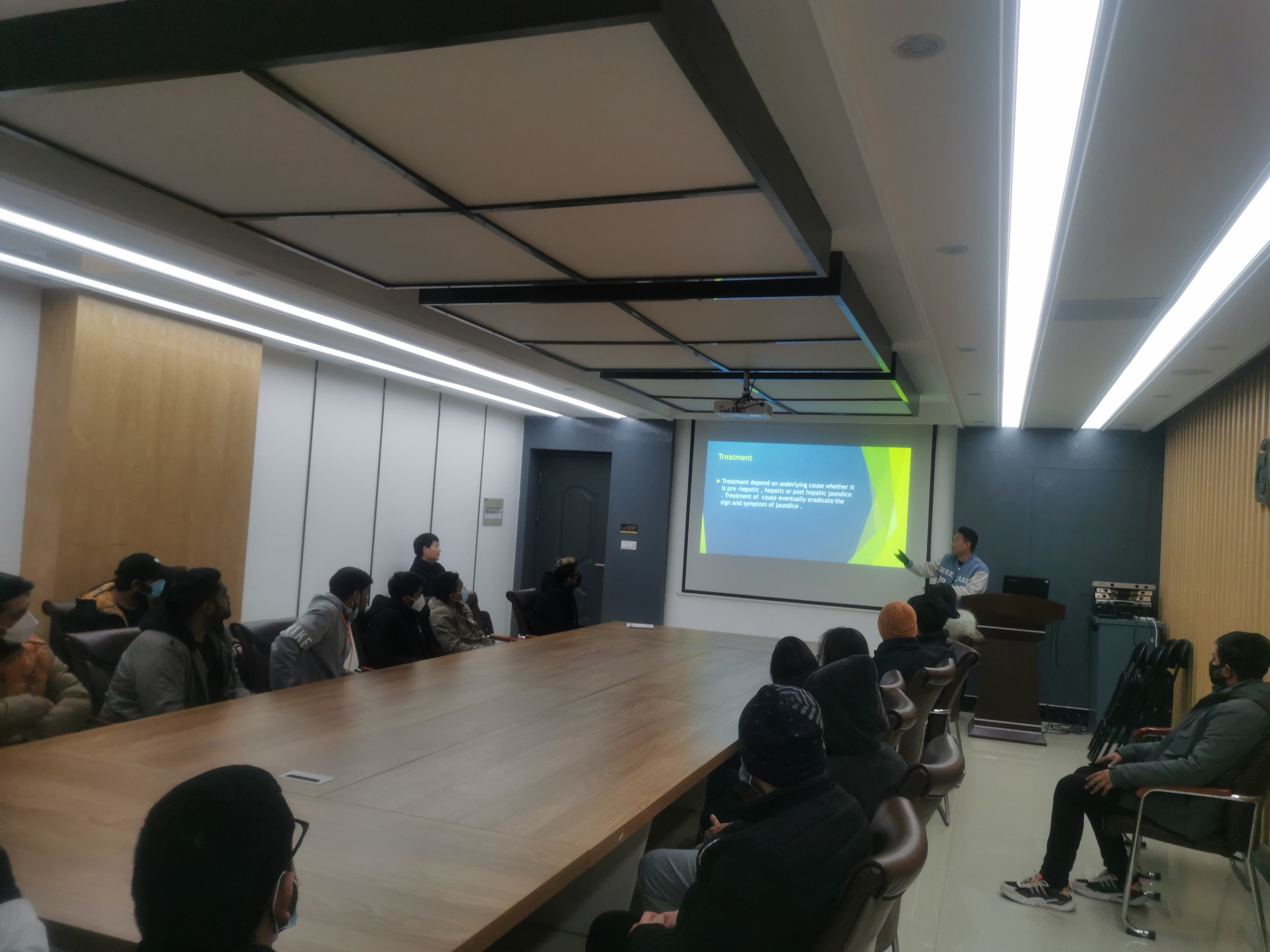 本期活动的讲解人是来自2017级THAPA RAJU(赫帕)和PURBEY KRISHNA(皮瑞汉)两位同学。赫帕的讲座专题是“黄疸”,常见于肝胆系疾病。该生台风自然,准备充分,用将近四十分钟的时间为同学们讲述黄疸的发病机理、临床表现、体格检查和治疗预后;皮瑞汉的演讲专题是“多囊卵巢综合征”,一种女性育龄期常见的内分泌疾病,并从疾病探究、症状体征、发病原因、典型症状、难点痛点、治疗护理六方面进行阐述,博得同学们的热烈掌声。
