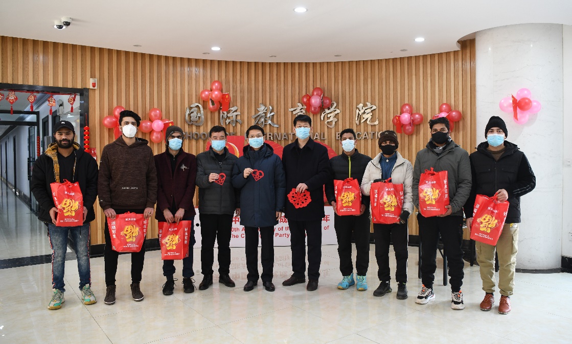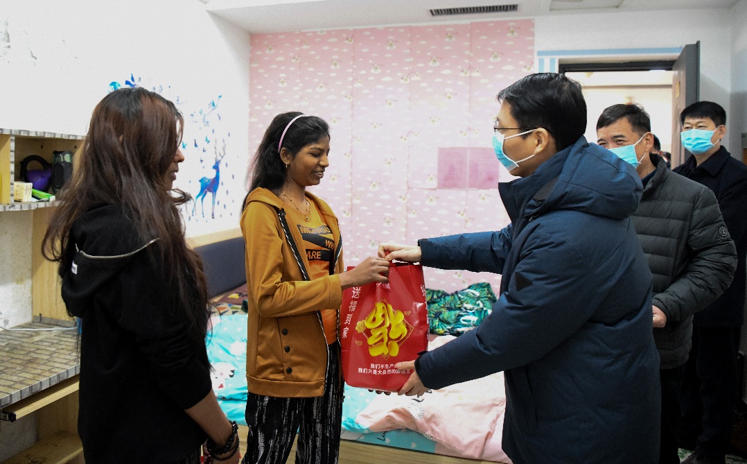 1月30日,农历腊月二十八,正值春节来临之际,为让寒假期间留校国际学生感受到家的温暖,更好的融入春节氛围,校党委委员、副校长朱武凌到国际教育学院看望我院留校国际学生,送上新春祝福。
