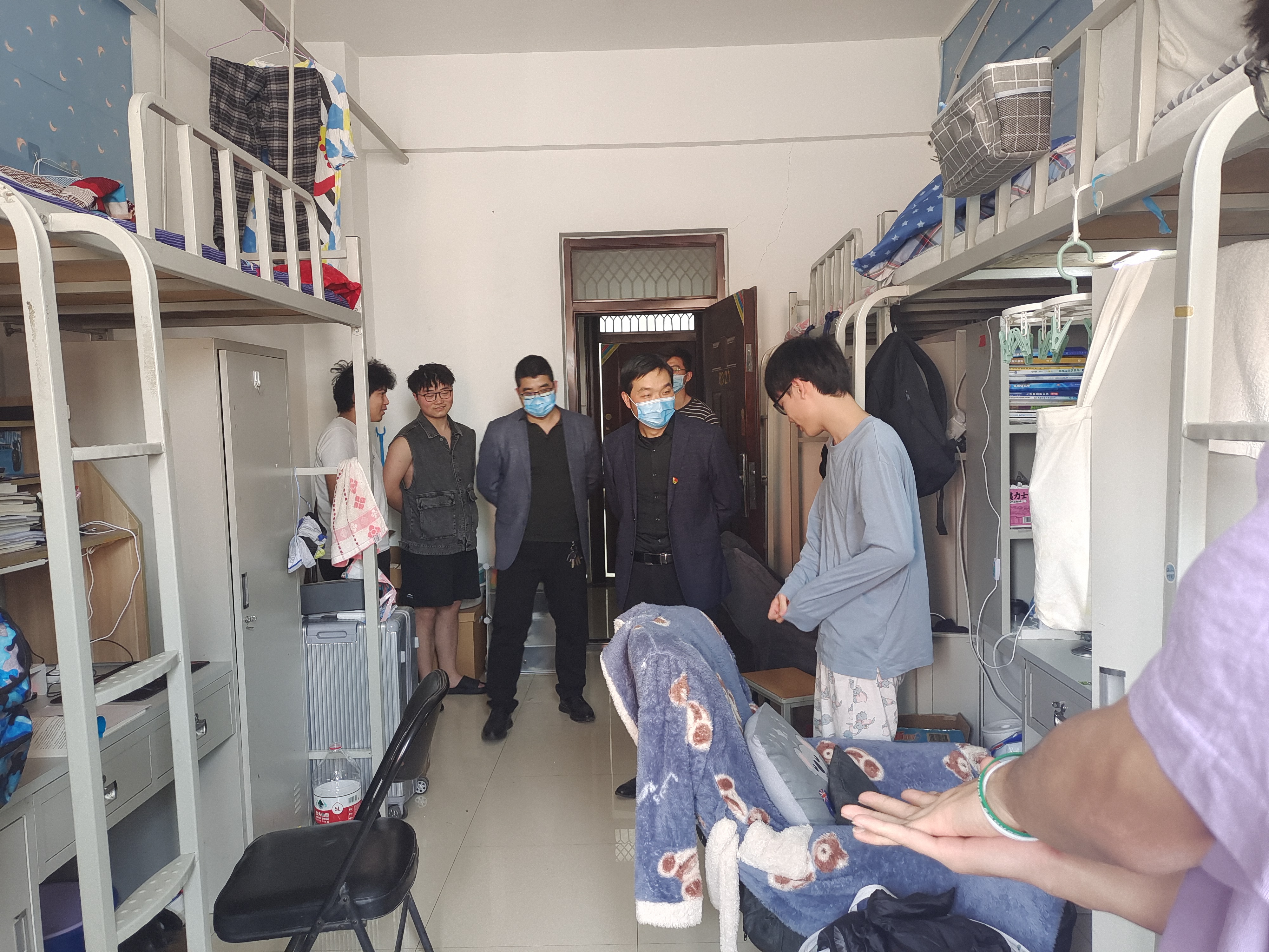 走访过程中,各位辅导员亲切地与宿舍的每一位学生交谈,关心同学们在疫情期间的正常生活学习是否受到了影响,提醒同学们目前仍然处在疫情防控关键阶段,切不可放松防控意识,应严格执行学校的防控管理规定和相关部署安排。李书记在走访中向同学们着重强调三点:一是要认识到疫情影响的严重程度,非必要情况不离校;二是要肩负起新时代青年的责任,以积极主动的姿态做好疫情防范工作;三是要不信谣、不传谣,多在学习上下功夫。