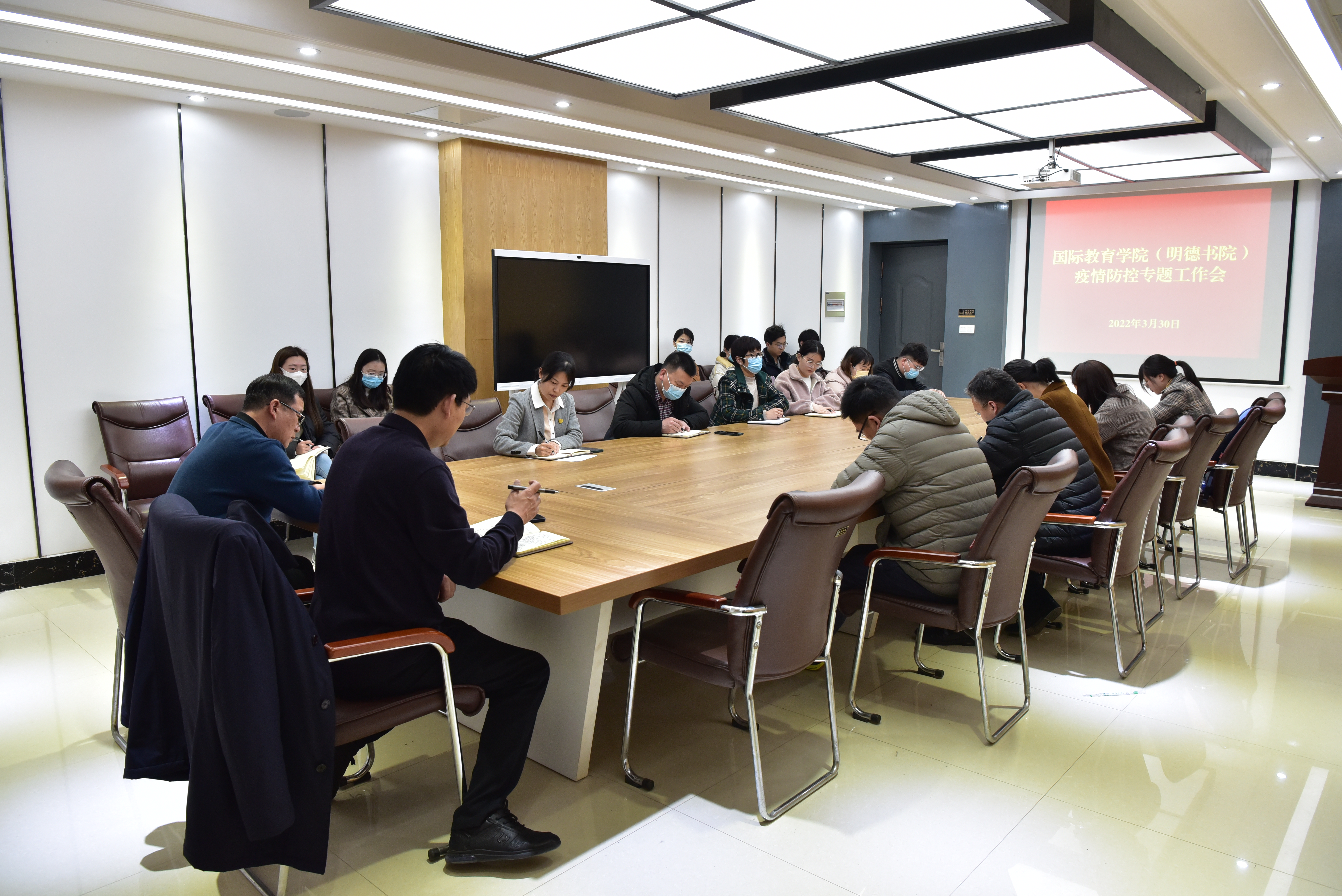 为进一步强化管控措施,做好疫情防控工作,3月30日明德书院、国际教育学院先后召开了疫情防控专题工作会,对常态化疫情防控工作再动员、再部署、再落实。我院领导班子及全体教职工参加会议。