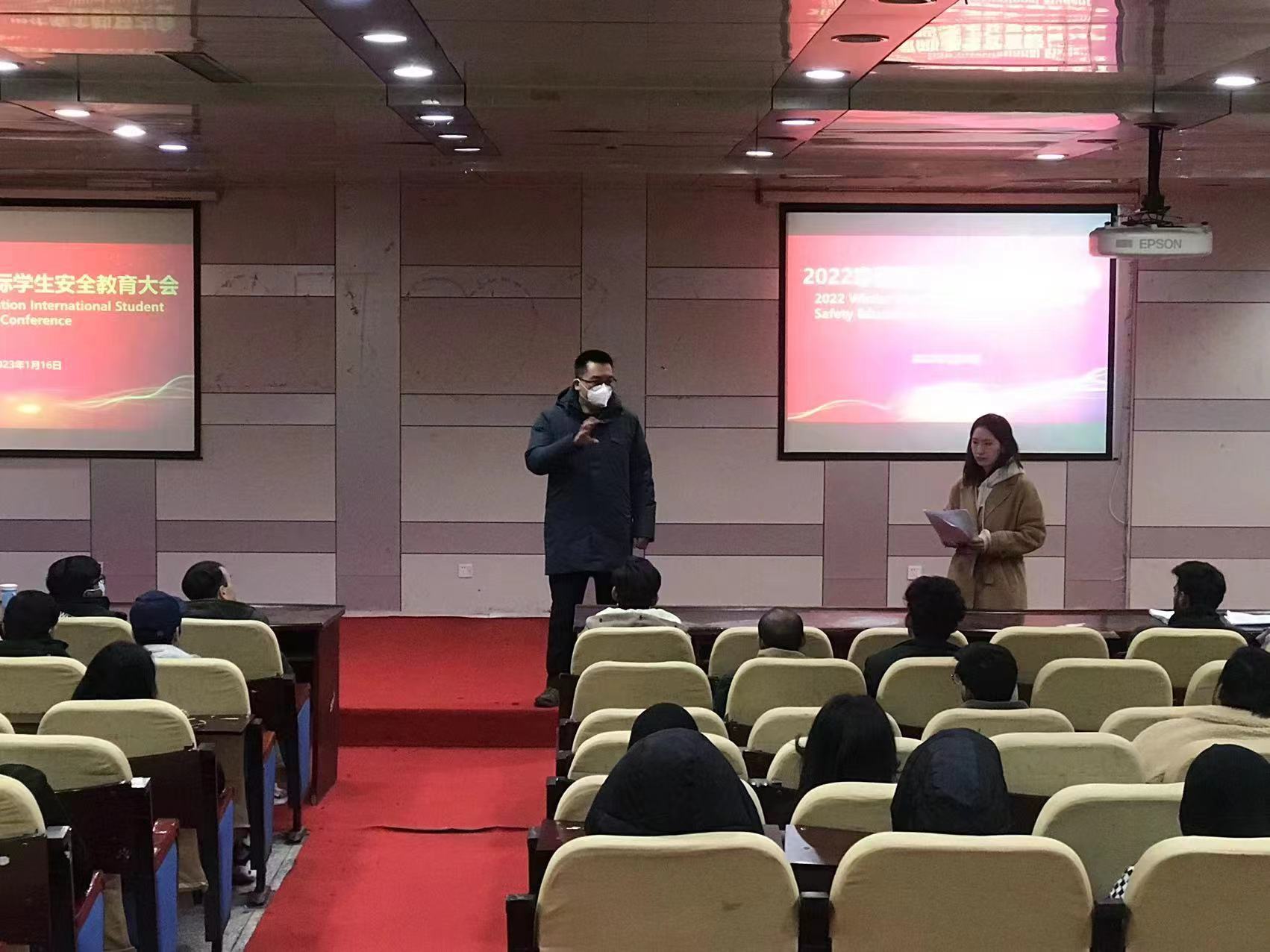 为了保证在校留学生度过一个安全稳定的春节假期,2023年1月16日下午,我院在第二报告厅顺利召开全体国际学生寒假安全教育大会,留学生科主管副院长李军和留学生科全体人员参加会议。