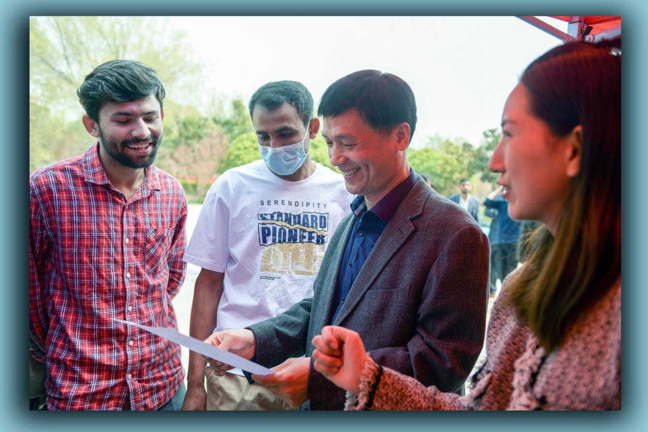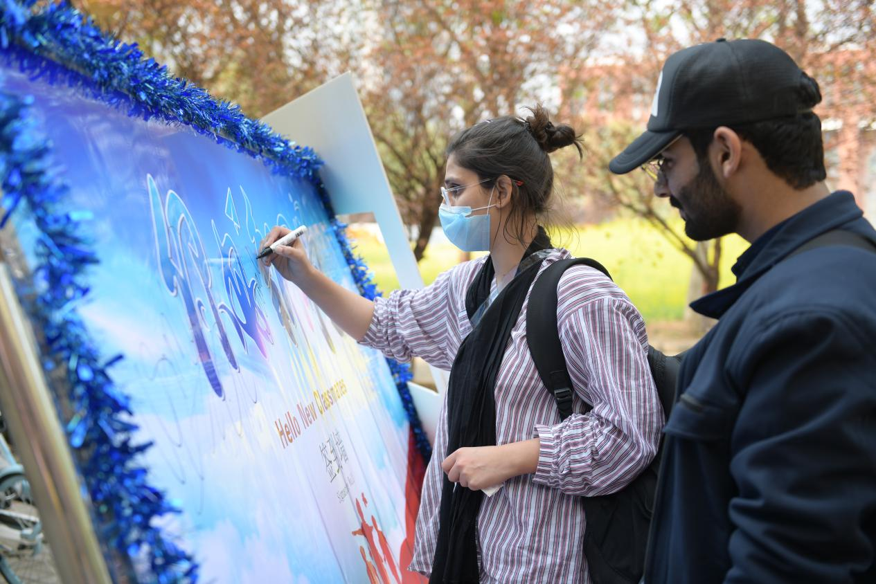 华谊楼小广场上大大小小的行囊,记录了国际学生辗转的行程,校园里和煦的春风,带走了国际学生旅途中的仆仆风尘;一张张激动兴奋的脸庞,写满了对新校园、新学期的向往和期待。忙碌的志愿者穿梭在各个报到点之间,签名领校园卡、领宿舍钥匙、办手机卡……返校的国际学生井然有序地办理着各项手续。“你好,新同学”的签到墙上,不断有新的名字跃然而上。国际教育学院领导班子成员深入各个报到点,关心新生报到情况,慰问工作人员和志愿者。