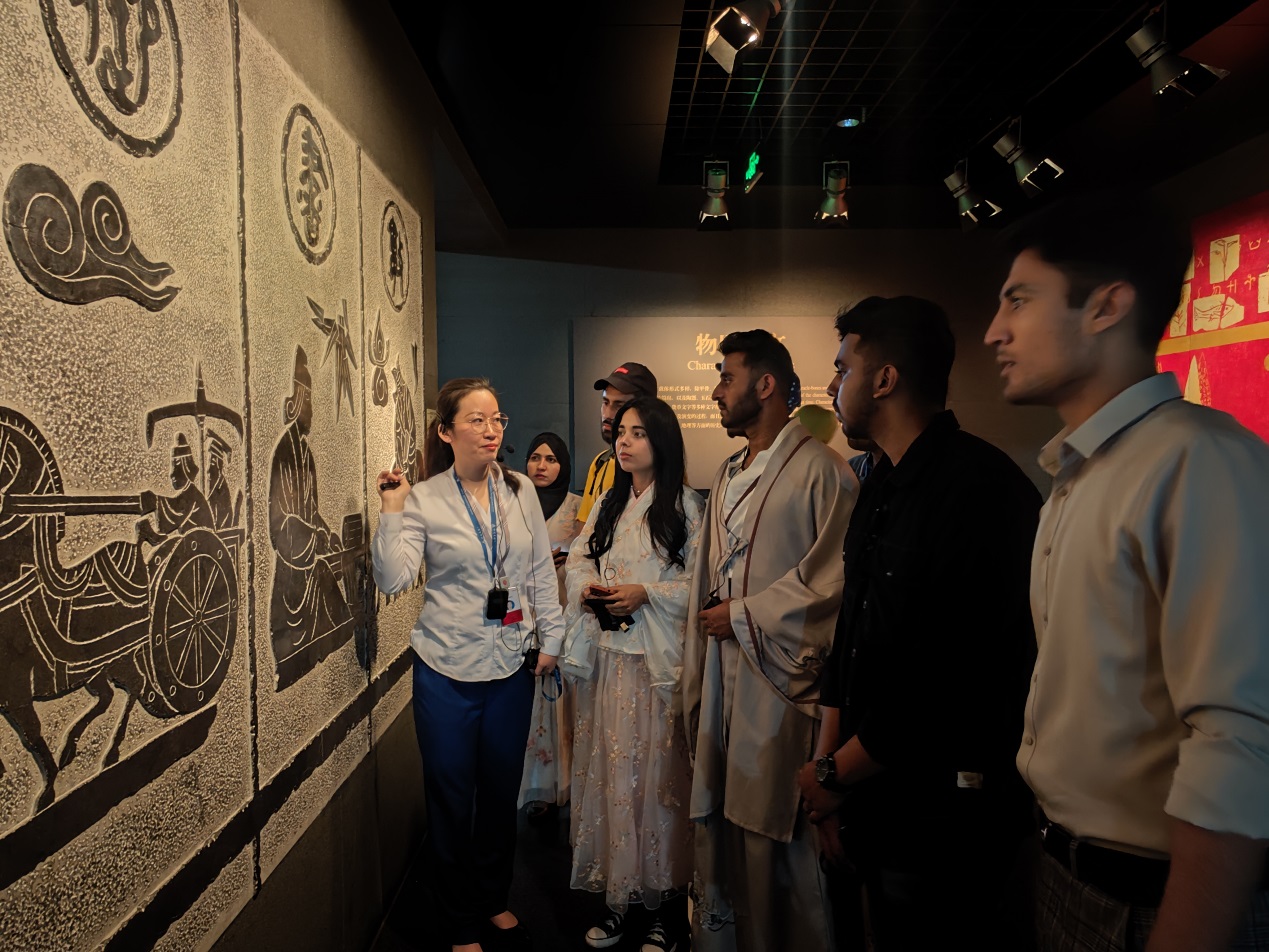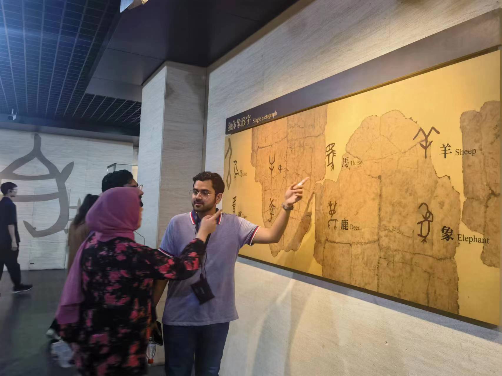 本次活动以穿越之旅的方式,让中国学生与国际学生沉浸式地感受中华传统文化的魅力。中外学生在讲解员和带队教师的引导下,参观了多个展厅,包括“汉字源流绎古今”、“甲骨纪事”、“钟鼎千秋”、“物以载文”和“从印刷术到信息化”。他们亲眼目睹了甲骨文字的发展历程和汉字文化的交融,同时也深受保存完好的贵重文物——贾伯壶的震撼。最后,活动以互动小游戏“我比划你猜汉字”圆满结束。