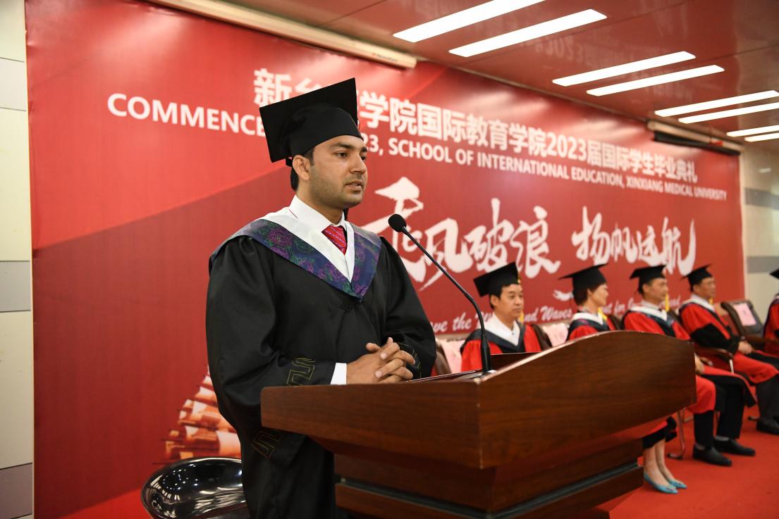 2017级本科生穆塞代表全体毕业生发言。他回忆了自己在新医的点滴生活,感谢了学校和老师对国际学生的培养和教诲,并向在校生分享了自己的学习和生活经验,表达了对母校的美好祝愿。