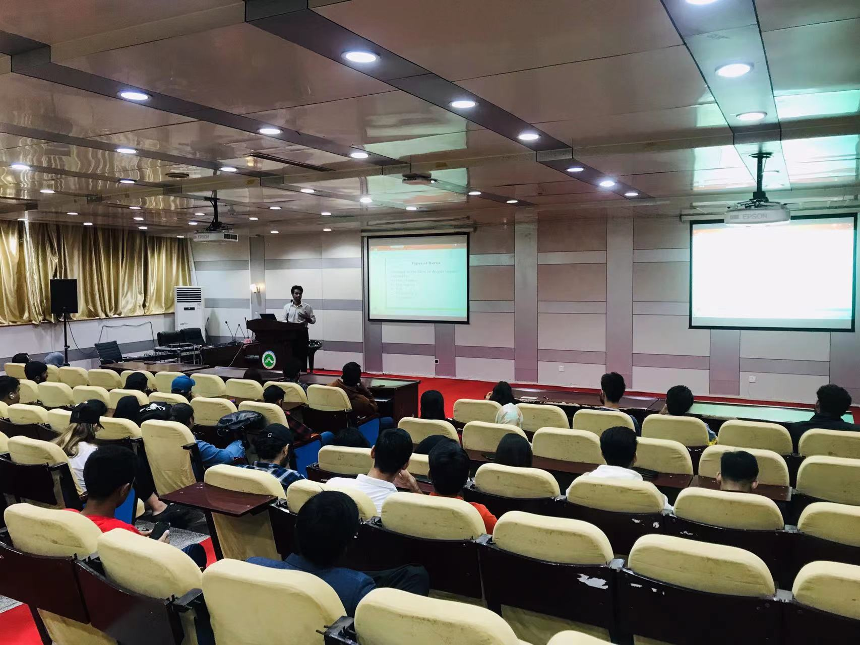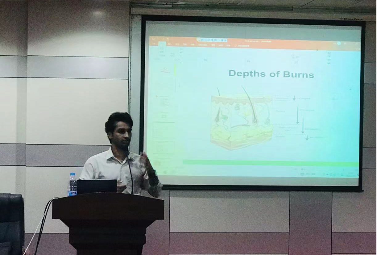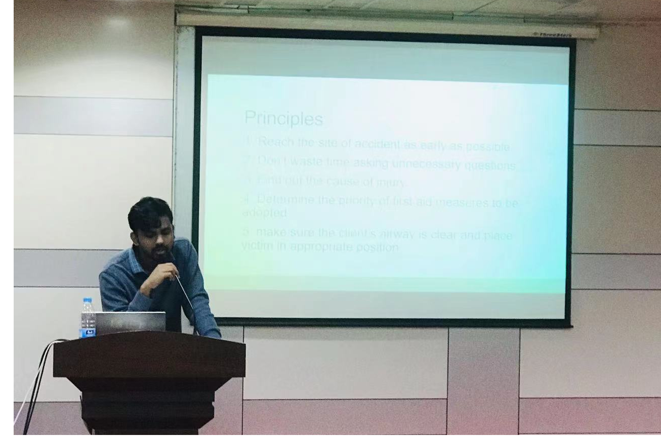 活动开始,雷曼(Abdul Rehman)首先开讲,他重点分享了关于烧烫伤的急救知识,包括日常生活中可能会引起烧烫伤的因素,烧烫伤的的种类和级别,以及烧烫伤后的急救方法,并演示了“冲脱泡盖送”五步急救法。作为第二位讲座嘉宾,山德士(Sandesh Banaita)结合生活中可能会遇到的溺水、受伤出血、骨折、异物卡喉、中毒等紧急情况,向同学们介绍了相应的自救急救步骤和技能,同时强调了在急救过程中的注意事项以及应急工具和药品。这些知识贴合日常校园生活,具有较高的使用价值和较强的可操作性。