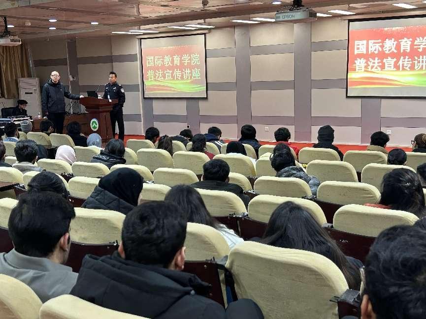 为进一步增强国际学生遵纪守法的安全意识,强调国际学生学习并遵守中国法律法规的重要性,打造平安校园一盘棋,国际教育学院于12月7日特邀华亿在线手机版(大中国区)社区民警杨志杰警官来我院开展普法宣传讲座。