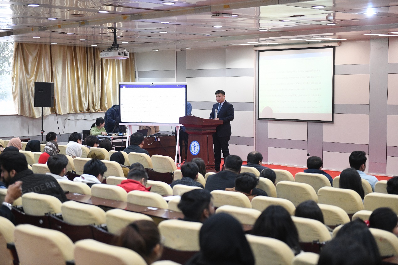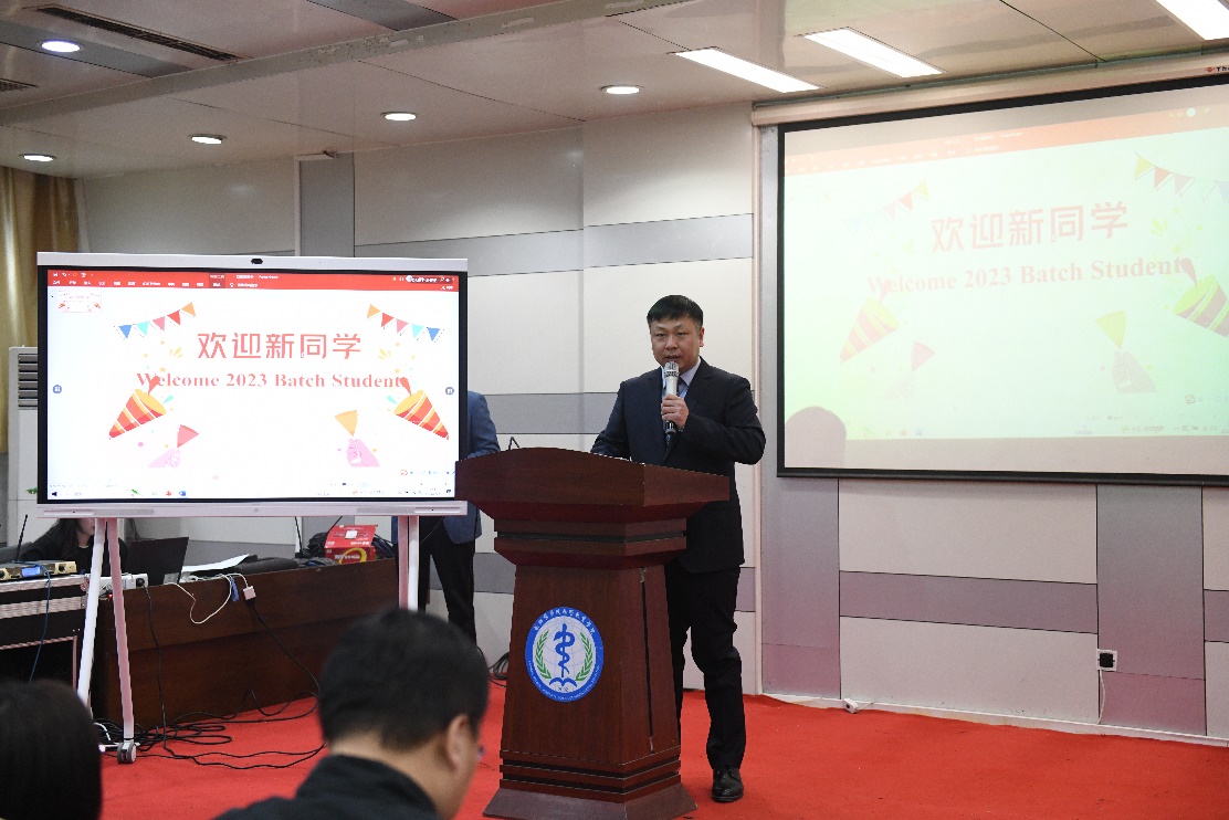 国际教育学院院长、直属党支部书记袁磊以“踏春而来,向日而行”为题,对新生旅途劳顿表示慰问,对新生选择新医作为人生的新起点表示感谢。他表示,新医深厚的底蕴、同学们要用优秀校友的榜样力量激励和完善自己,并借此向新生提了四点建议。一是学会适应。认同中国文化,做好传播中华文明的使者。二是懂得珍惜。坚定信念和目标,潜心学习专业知识,修养心性,提升技能。三是守住规矩。用国际教育学院遵规守约的院风浸润自己,学会自律。四是学好汉语。坚持用学母语的功夫,学专业的毅力,提升汉语能力。最后,袁磊院长祝愿新同学踏春而来,向日而行,为自己闯出一片充满阳光与幸福的美好天地。