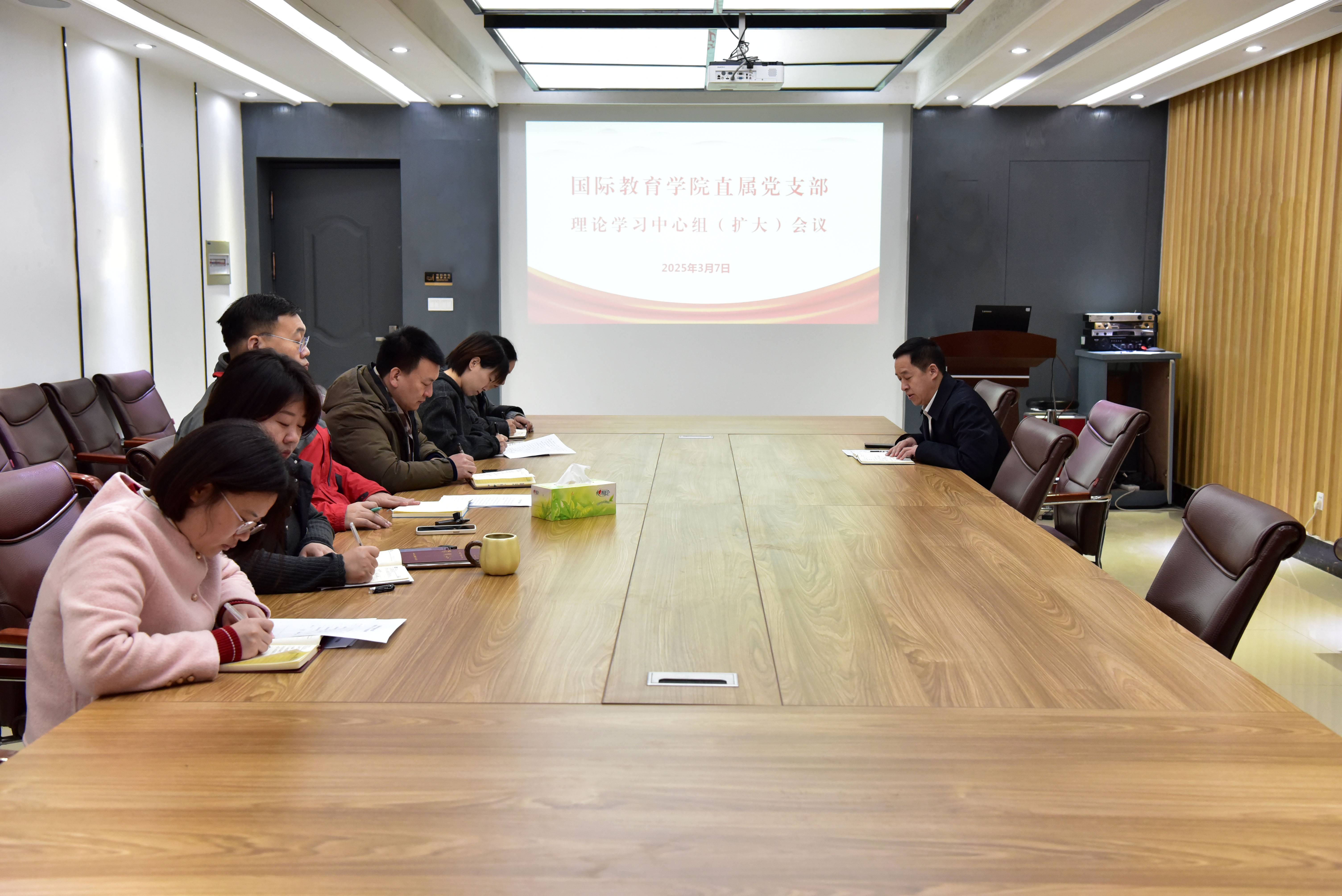 3月7日上午,学院直属党支部组织召开了2025年第2次理论学习中心组(扩大)会议,学院副院长吴玉东主持会议,理论学习中心组成员和科级干部参加会议。