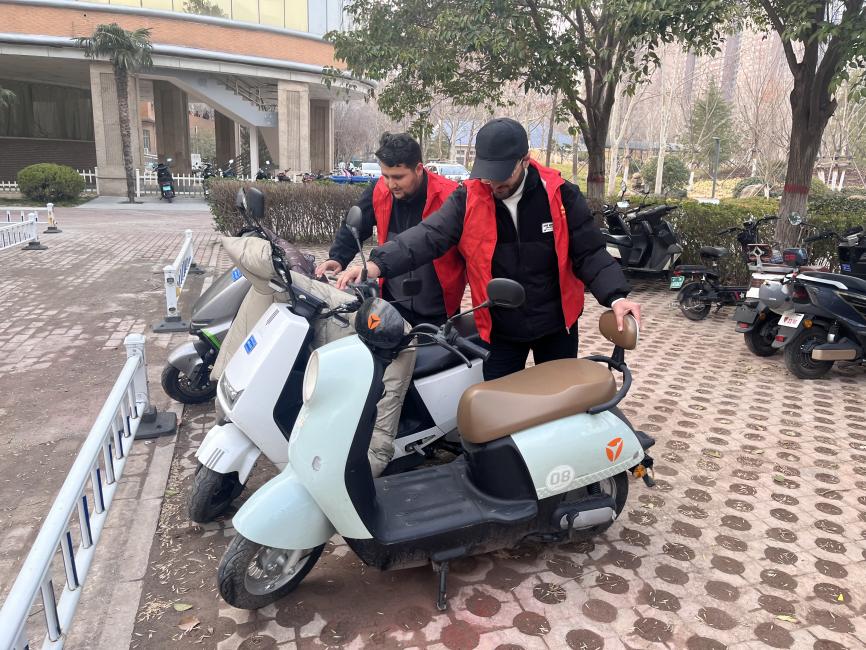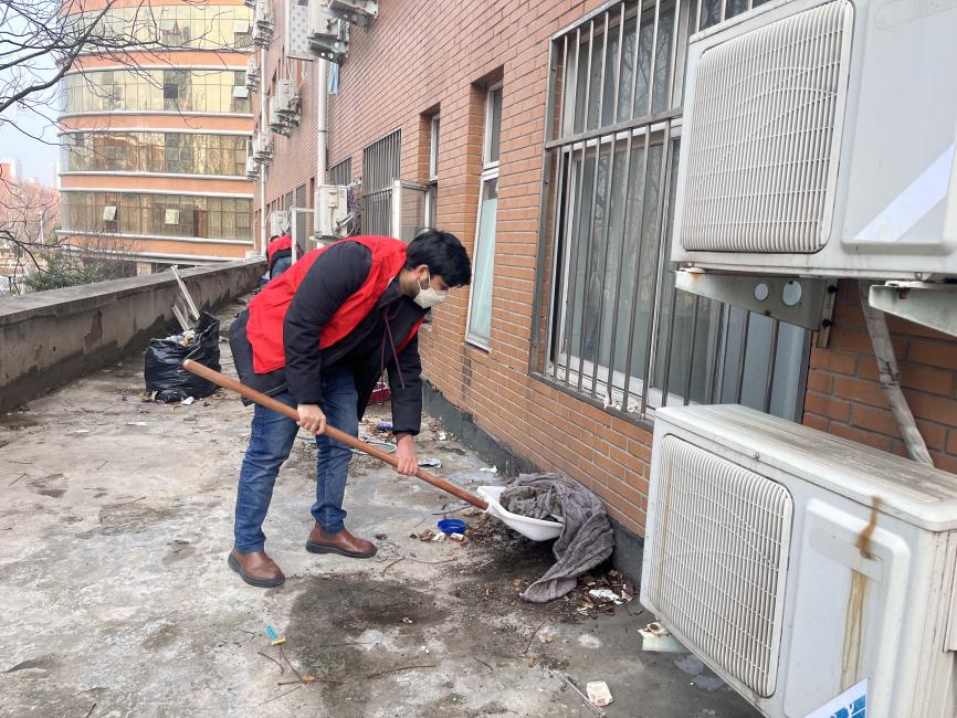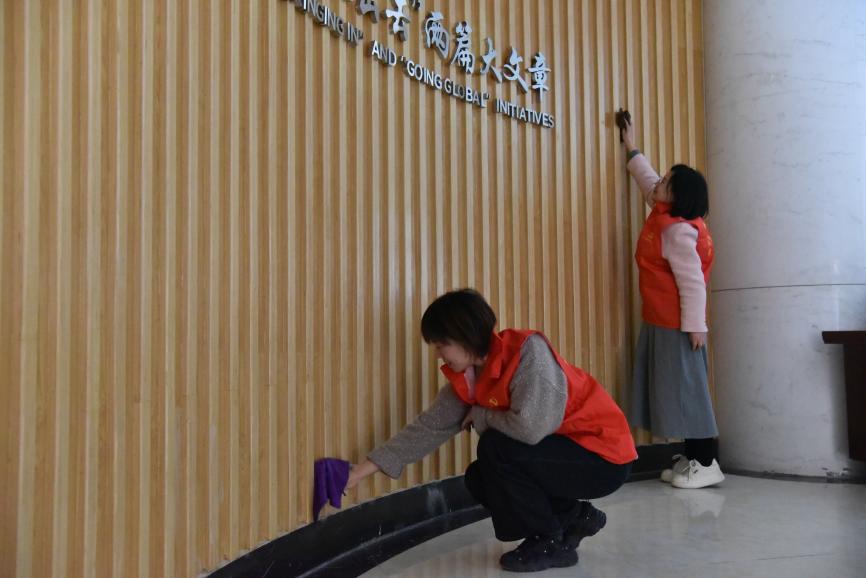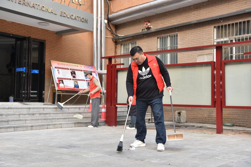 活动中,我院教职工和国际学生志愿者结伴而行,手持扫帚、抹布等清洁工具,对学院周边公共区域进行深度清洁。师生们分工协作,俯身清扫散落垃圾,精心擦拭大厅墙壁,清运枯枝落叶,并将散置的自行车、电动车有序归位至指定停放区。经过集中清理,学院周边环境焕然一新。