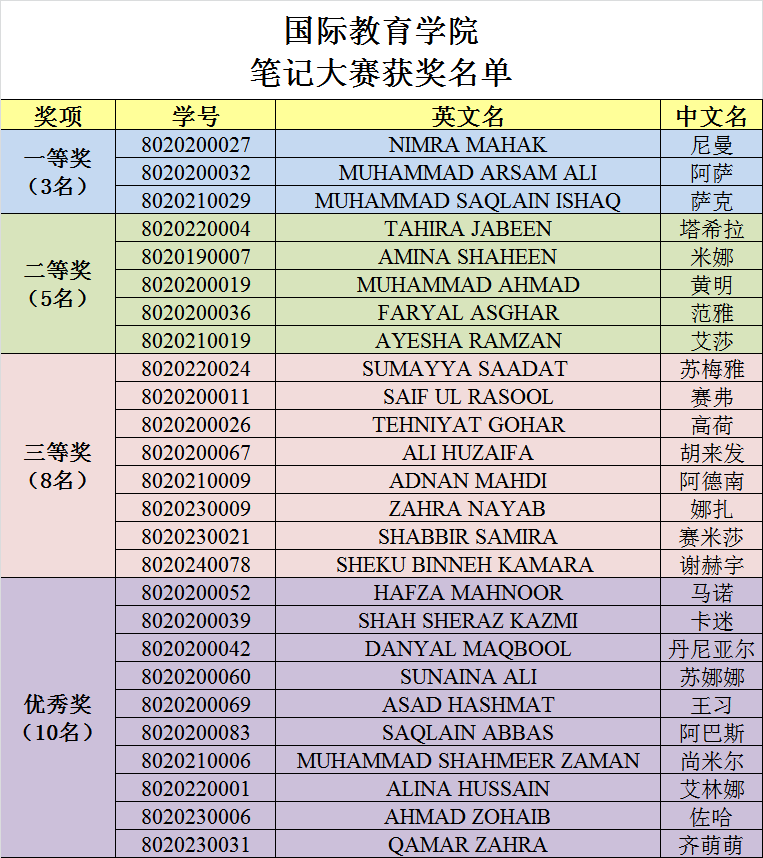 本次活动吸引了我校国际学生的广泛参与,共征集到参赛作品106份。笔记内容涵盖各年级培养计划内的通识基础课、专业基础课和专业课等。每一份笔记不仅是知识的载体,更是医学精神的缩影,记录着国际学生们在求医之路上的专注与成长。经"辅导员+学习班长"初审和专家终审,共有26名参赛作品脱颖而出,获奖名单如下: