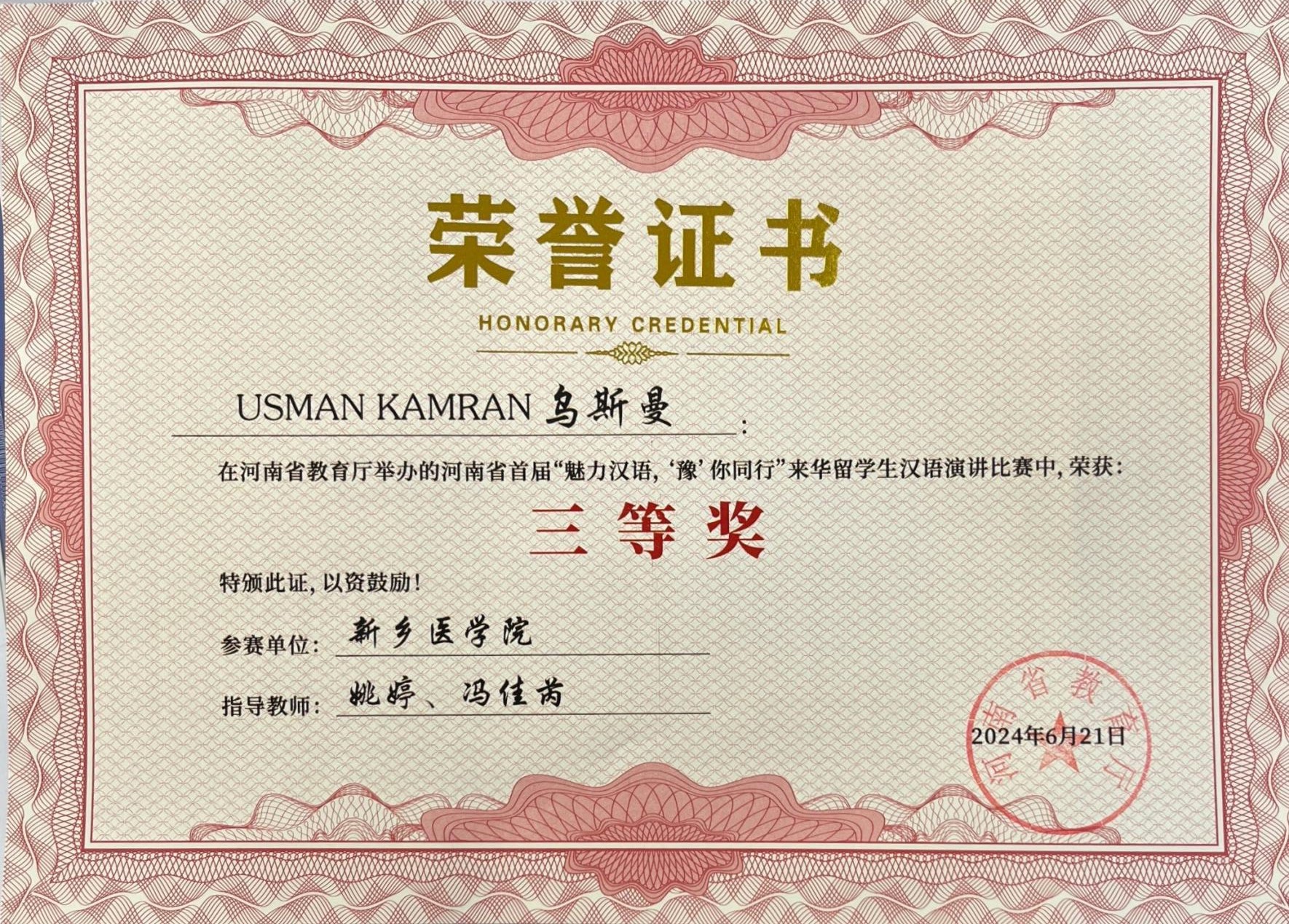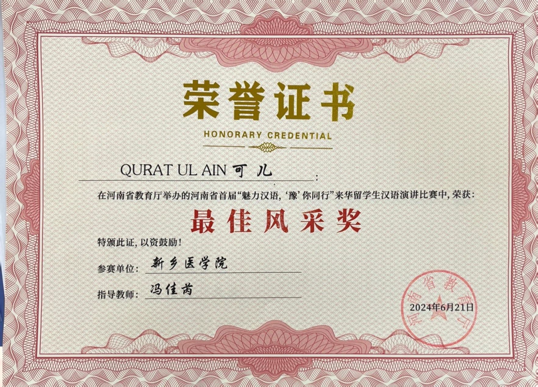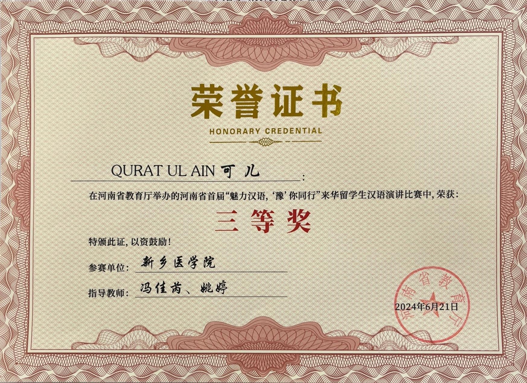 1.耐心做好留学生日常教育管理工作。重视文化育人,秉持“以赛促学,以学促行”的核心理念,悉心指导学生参与各类汉语与中国文化比赛。辅导2021级巴基斯坦籍学生可儿参加外研社2024年“理解当代中国”来华留学生中文短视频大赛,荣获铜奖;辅导2021级巴基斯坦籍可儿、乌斯曼参加河南省首届“魅力汉语,‘豫’你同行”来华留学生汉语演讲比赛,均荣获三等奖,其中可儿更以优异表现摘得最佳风采奖。