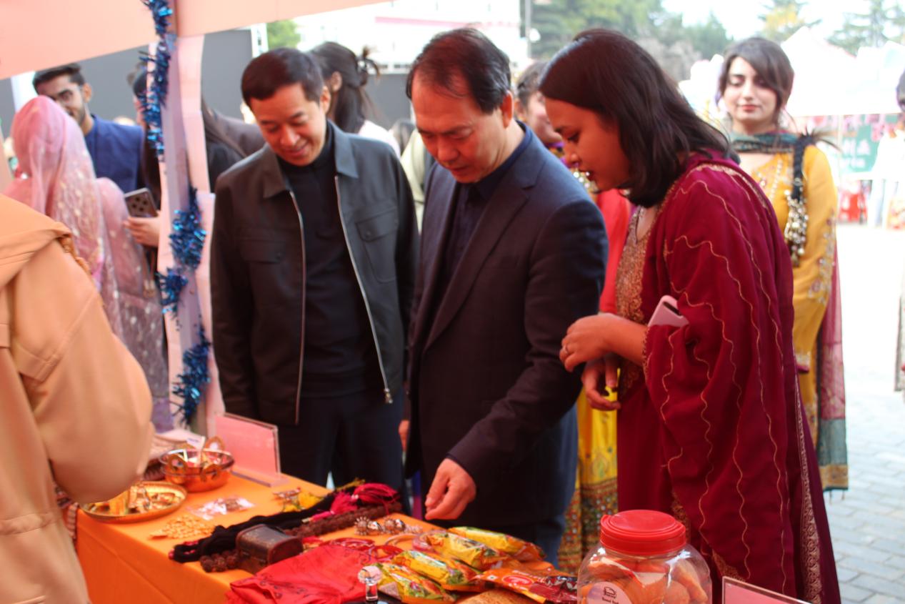 文化展上,我校特别设立了尼泊尔和巴基斯坦两个主题展区,各式各样的特色手工艺品吸引了众多师生的目光,让人仿佛置身于巴基斯坦和尼泊尔的传统市场。副校长雒保军及国际教育学院副院长吴玉东亲临活动现场并与我校国际学生亲切交流,鼓励学生努力学习汉语,为自己未来在中国留学、就业铺设了道路,也为自己未来寻找工作增添独特的竞争优势。