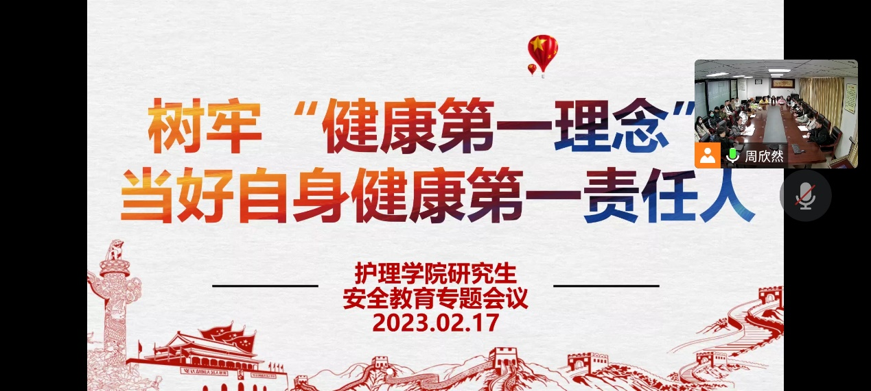 为做好2023年春季学期研究生安全教育管理工作,提高护理学院研究生的安全防护意识,增强同学们的安全防范能力,防范意外事故的发生。2月17日,护理学院采用线上线下相结合的方式召开了全体研究生安全教育主题班会——“树牢‘健康第一理念’当好自身健康第一责任人”,护理学院副院长王丽娜、研究生兼职辅导员孙俊俊及全体研究生参加了本次会议。