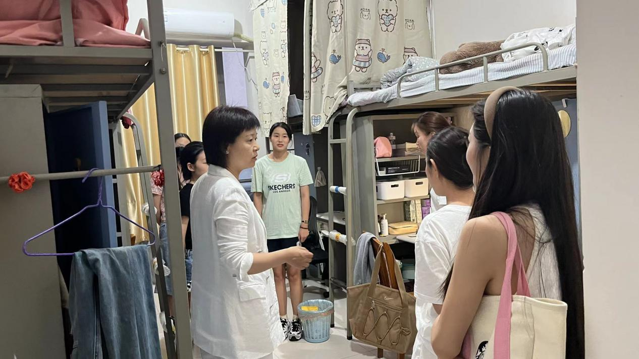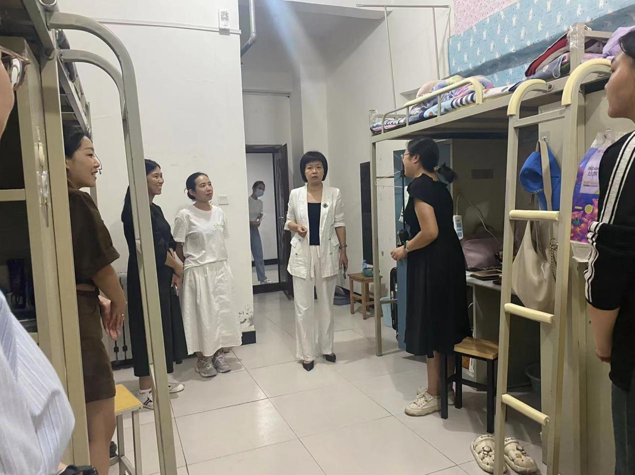 为及时了解2023级新生入校情况及思想动态,努力为同生们营造安全、安静、整洁、文明的学习和生活环境,引导大家尽快适应研究生生活,护理学院王丽娜副院长、研究生管理办公室负责人张会敏老师、研究生兼职辅导员高晓磊老师于9月4日晚走进学生公寓,检查住宿保障工作,看望慰问新生。