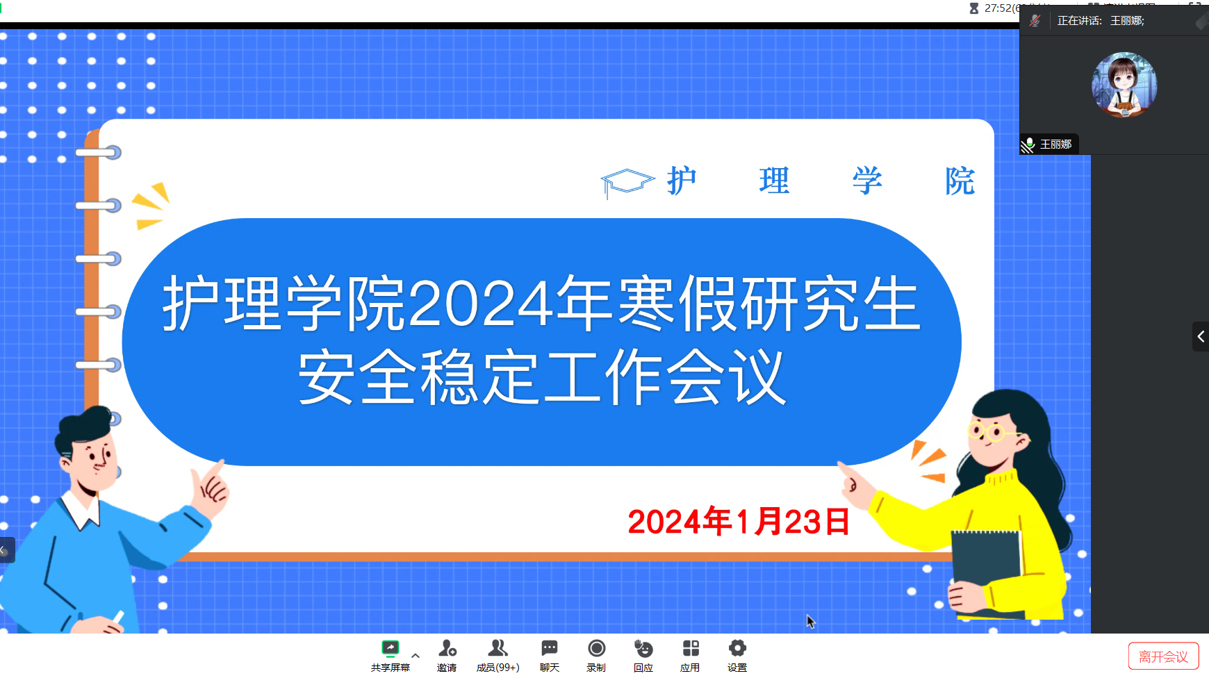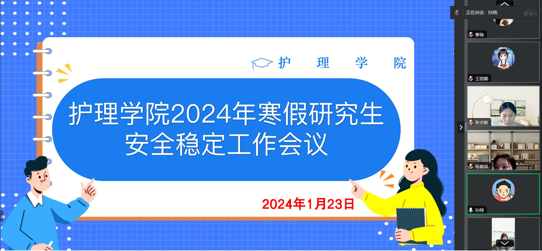 为普及全体研究生的安全知识,增强安全防范能力,提高安全意识,1月23日,护理学院举行了2024年寒假研究生安全稳定工作会议,此次会议采用线上的方式。参加本次会议的有学院党委书记孙翔、副院长王丽娜、研究生培养与学位建设办公室主任张会敏老师、兼职辅导员高晓磊老师、全体研究生导师及护理研究生。本次会议由张会敏老师主持。