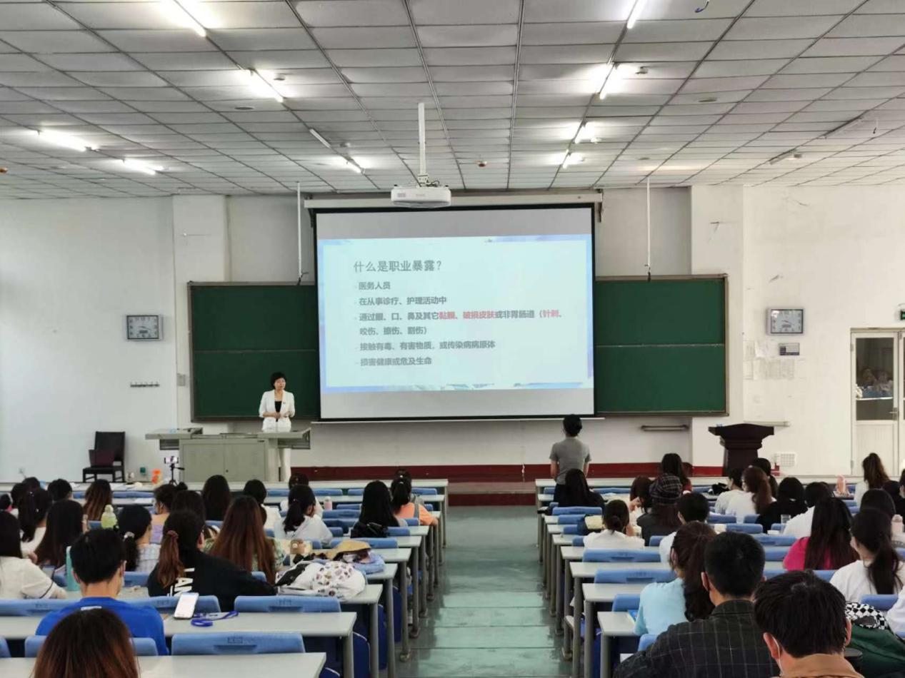 23日上午,王丽娜副院长以职业暴露与防护为主题,就医护人员的职业暴露风险、如何做好防护措施以及发生职业暴露后的处理等三个方面精心为同学进行了讲解。王院长通过提问、举例等手段与同学们保持良好互动,为同学们讲解了临床操作中容易出现的职业暴露情况,使同学们提前掌握职业防护基础知识,充分有效做到自我防护,为接下来的实习奠定了较好基础。受到同学们的热烈欢迎和积极响应。