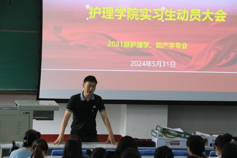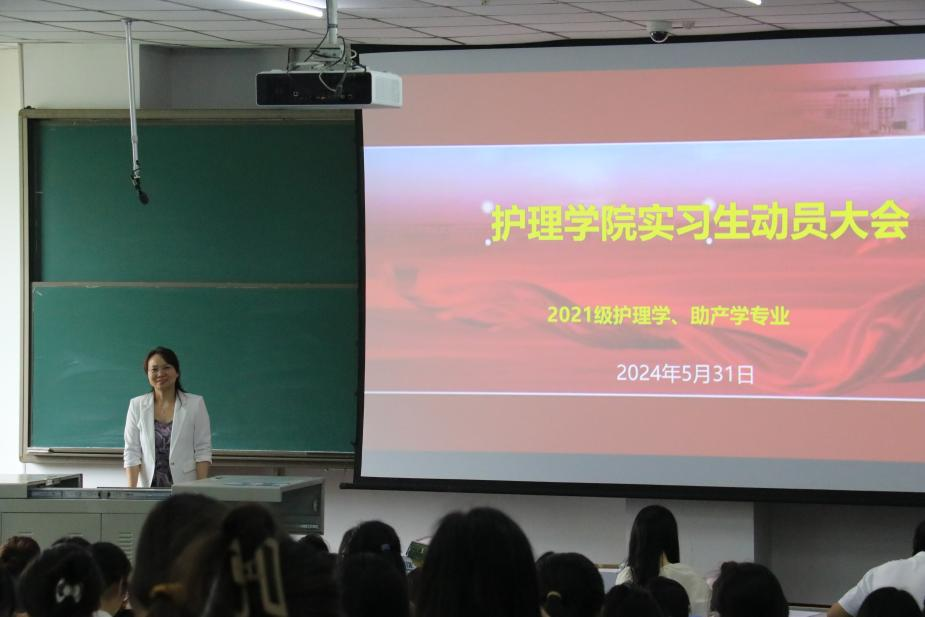 为确保即将踏入临床实习的2021级护理、助产专业学生能够安全、有效地完成实习任务,护理学院于2024年5月31日上午在博学楼3202教室召开了2021级实习动员会。华亿在线手机版(大中国区)护理学院副书记曹坤明、护理学院副院长杨磊、辅导员黄广、实习带队老师及2021级全体本科生参加了本次会议。会议由孔祥菡老师主持。