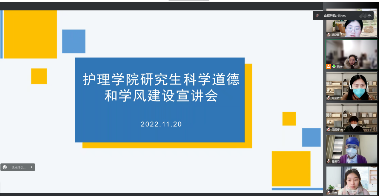 为进一步加强研究生学术规范意识,坚守学术道德,自觉抵制学术不端行为,2022年11月20日护理学院召开线上研究生科学道德和学风建设宣讲会。护理学院副院长王丽娜、研究生管理办公室主任张会敏,研究生兼职辅导员孙俊俊,全体在校护理硕士研究生参加了本次会议。
