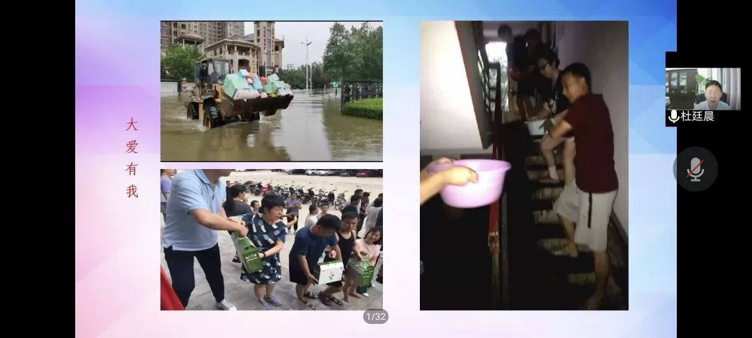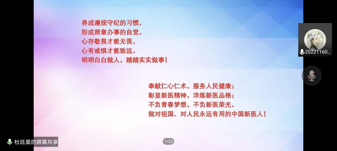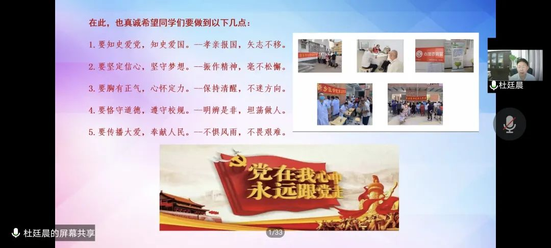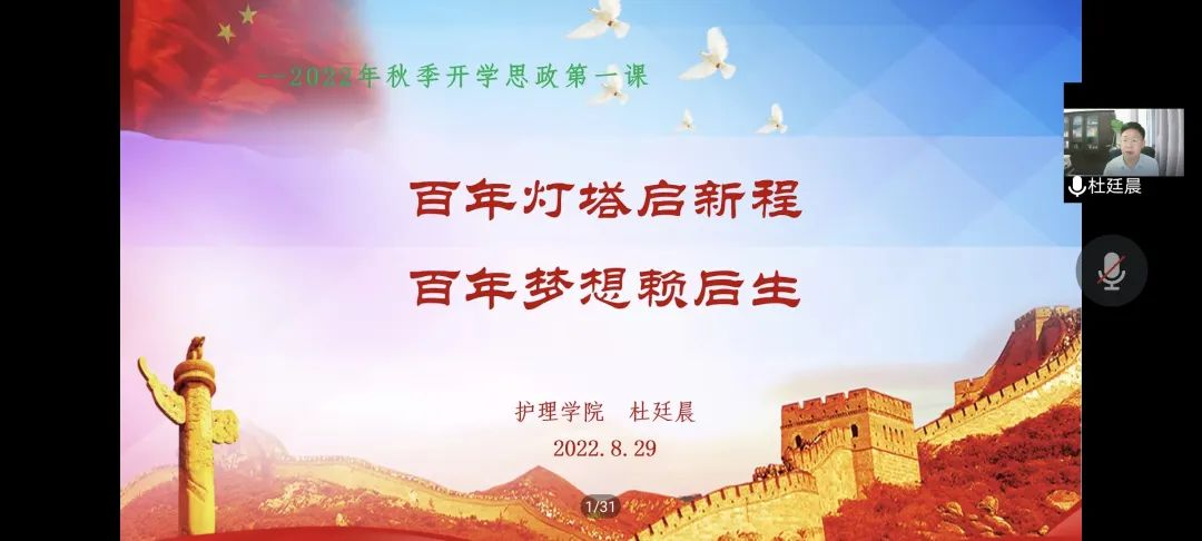为加深学生对我国制度优势与大国担当的理解,引导新生努力把个人理想与中国梦结合,2022年8月29日下午6:30,护理学院党委书记杜廷晨以“把灾难当教材,与国共成长”为主题,用鲜活的案例给大一新生开设了一场生动的爱国主义教育。本次会议采用“网络直播+在线互动”的形式,由我院辅导员张晨曦主持,2022级全体新生参加。