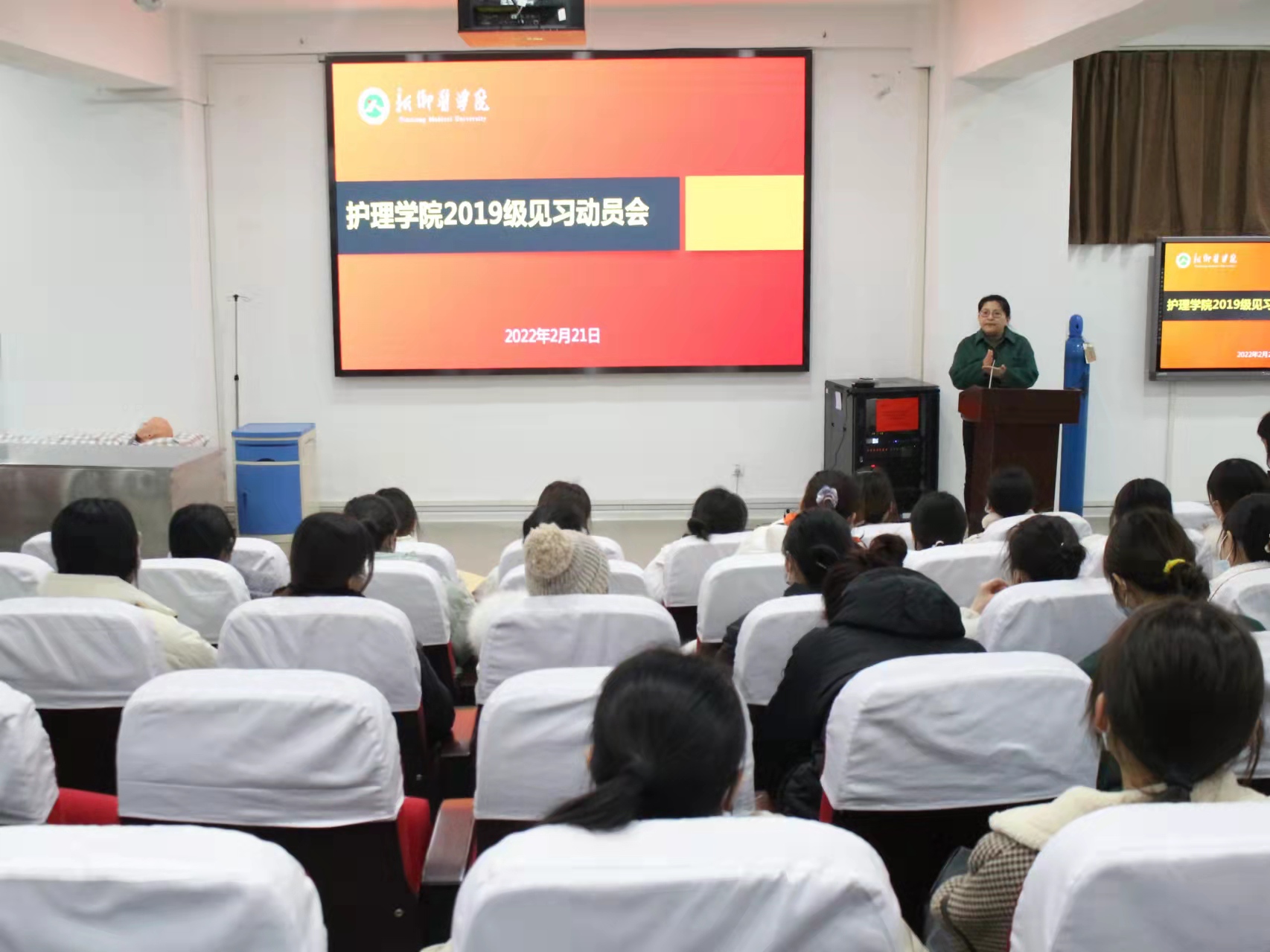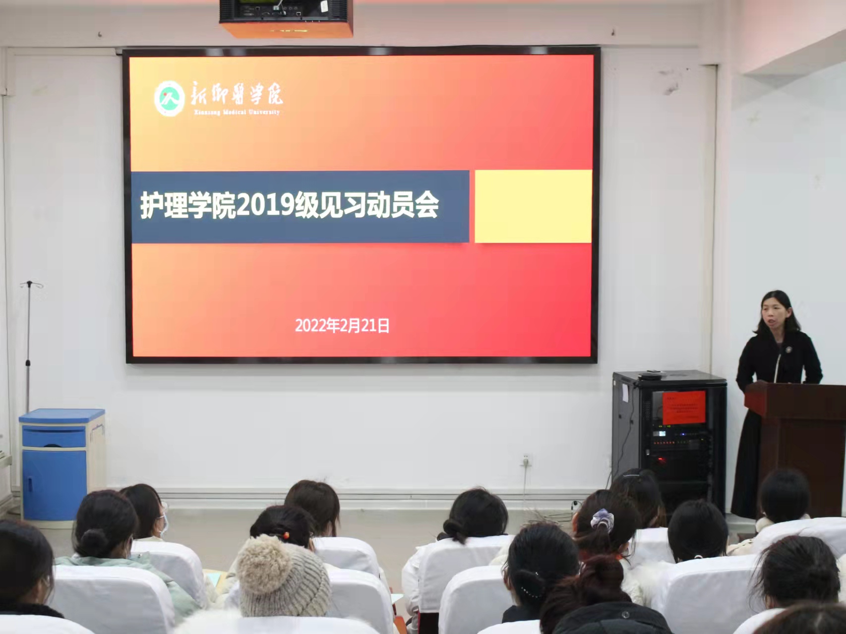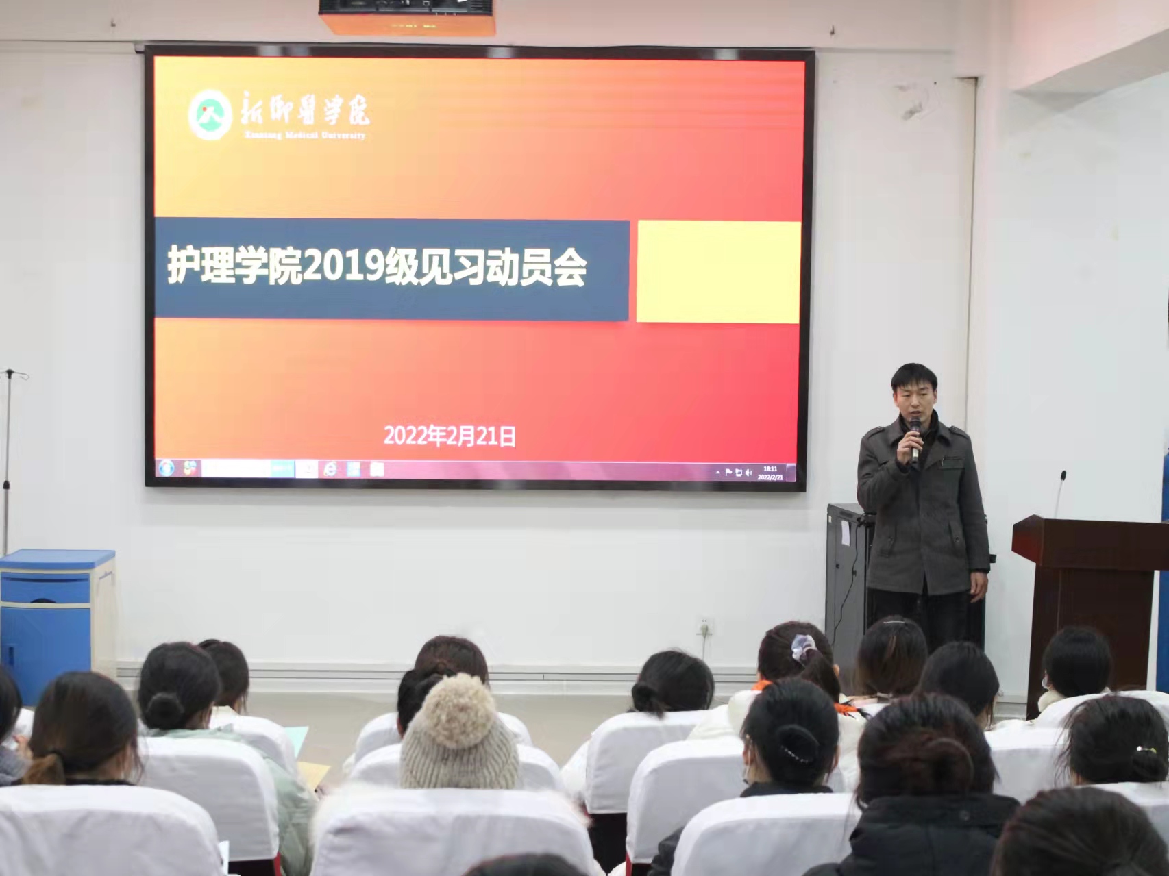 为使我院学生做好临床见习准备,更好完成临床见习任务,我院于2月21日下午五点四十在学院示教室召开2019级见习动员大会。护理学院副院长曹坤明、教学管理与专业建设办公室主任朱丽丽、学生工作办公室主任韩冰以及我院2019级全体学生参加此次会议。