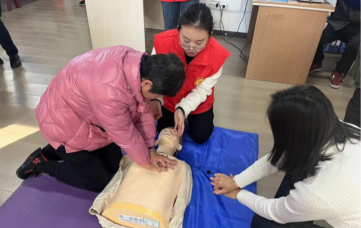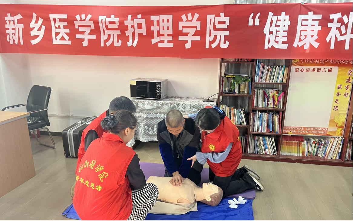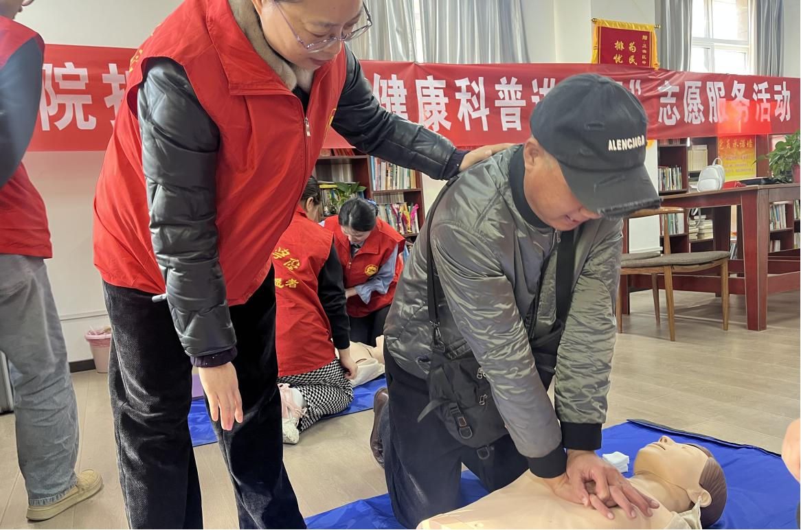 后护理学院师生分组指导社区居民及工作人员进行心肺复苏术各环节的操作练习。