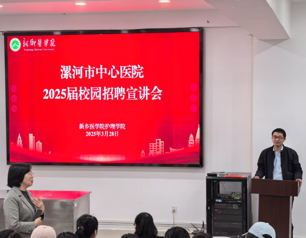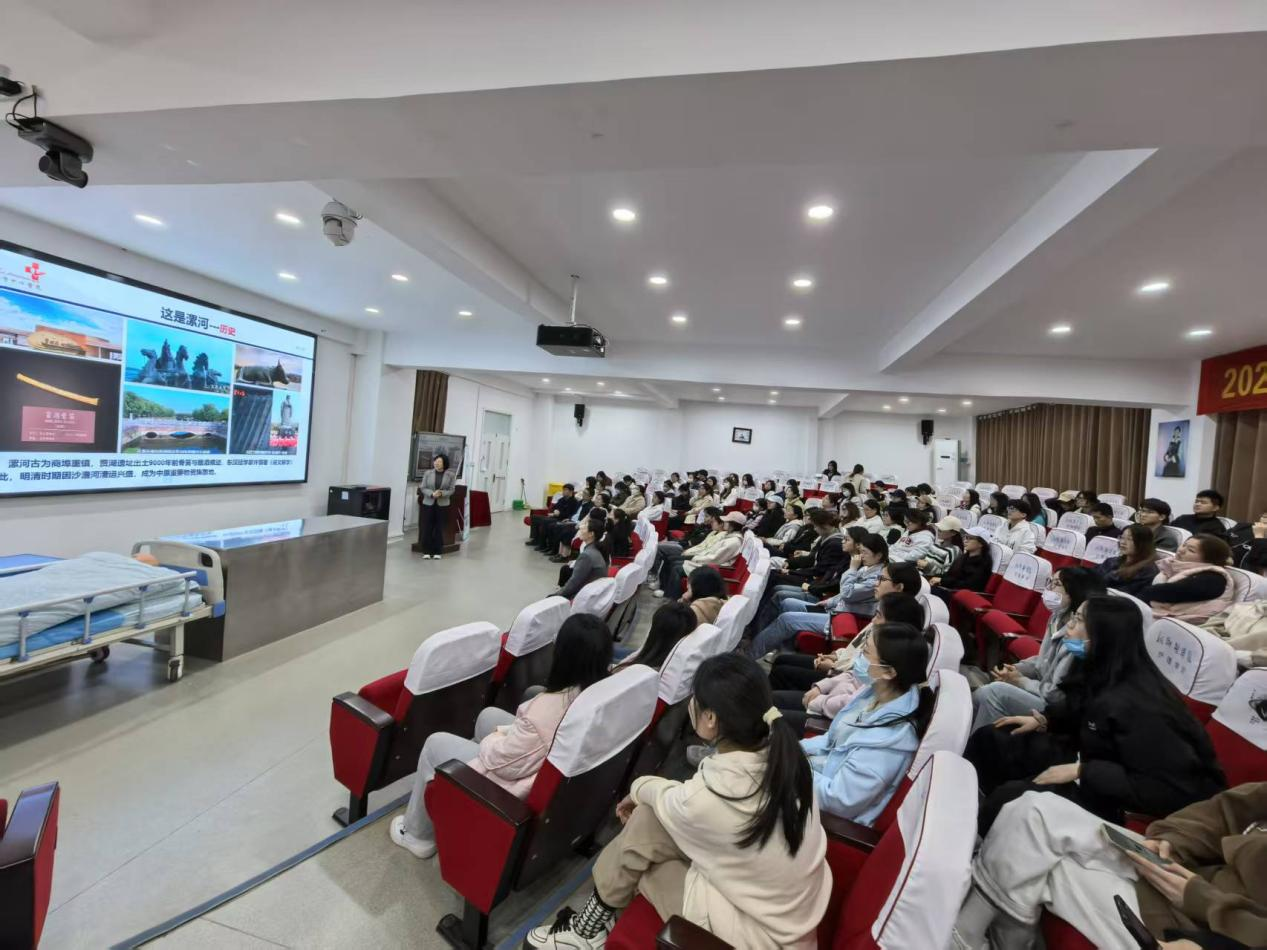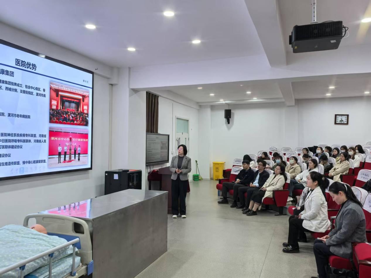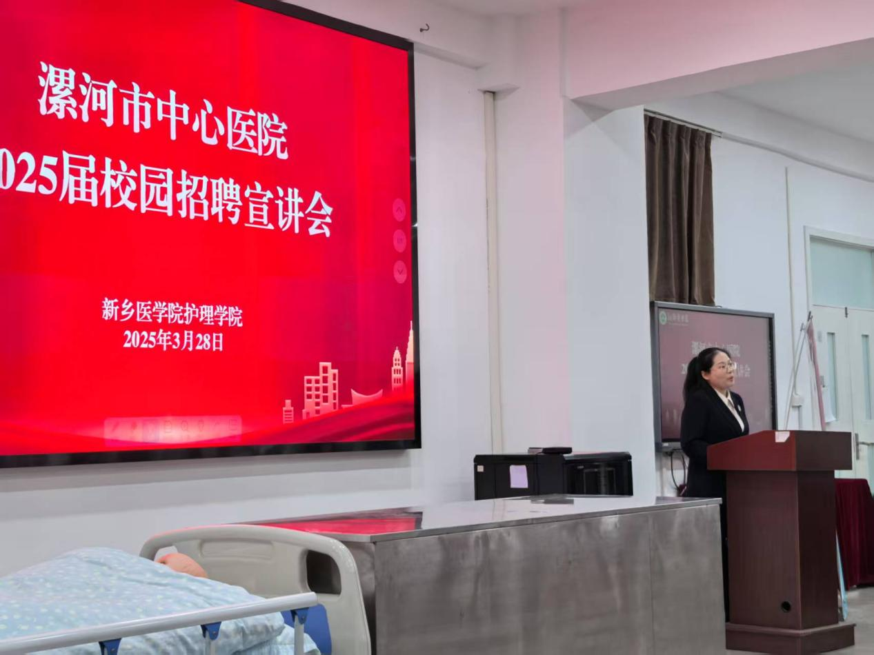 与会人员还参观了护理学院实验教学中心,实地了解学院教学实践环境。在西校区问学楼示教室,与会师生共同观看了漯河城市形象宣传片《今朝漯河》。随后,侯新凤主任以“漯河市中心医院护理概况”为题作报告。详细介绍了医院厚重的历史、完善的护理管理服务架构、优质护理创新举措、强有力的护理人才培养计划,介绍了漯河市人才引进政策及2025年医院人才招聘计划,她勉励广大学子努力提升职业素养,强化专业技能训练,共谋护理事业高质量发展。我院校友、漯河市中心医院神经内一病区主管护师马静结合自身工作经历,为与会同学分享了其从业的心路历程与宝贵经验,从校园到职场,从理论到实践,她用行动与激情诠释了护理人的坚守与热爱。