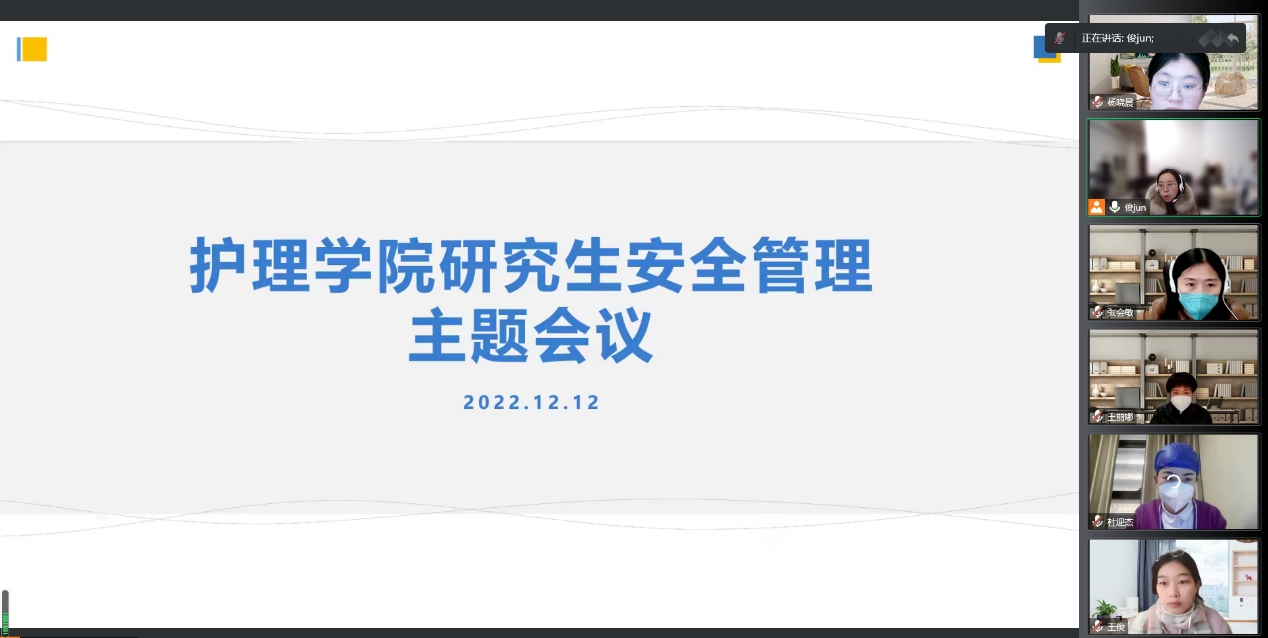 为进一步加强研究生安全管理工作,提高护理学院研究生的安全防护意识,增强同学们的安全防范能力,防范意外事故的发生。2022年12月12日,护理学院召开了全体研究生线上安全管理主题会议,护理学院副院长王丽娜、研究生管理办公室主任张会敏、研究生兼职辅导员孙俊俊及全体研究生参加了本次会议。