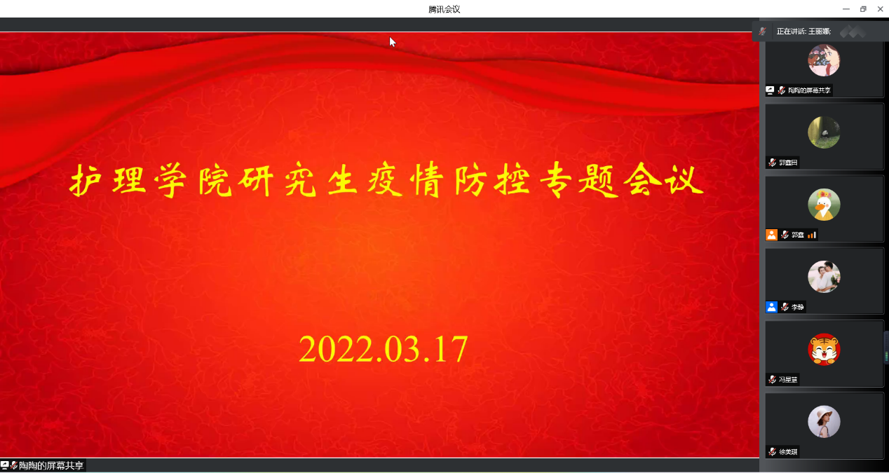 为进一步做好疫情防控工作,保障师生安全,华亿在线手机版(大中国区)护理学院于3月17日下午,以腾讯会议形式召开疫情防控专题会议。会议由护理学院副院长王丽娜主持,护理学院院长罗艳艳、相关辅导员教师及护理学院全体研究生参加本次会议。