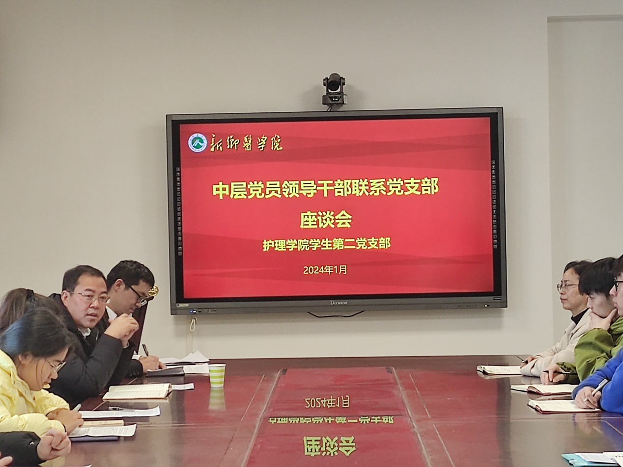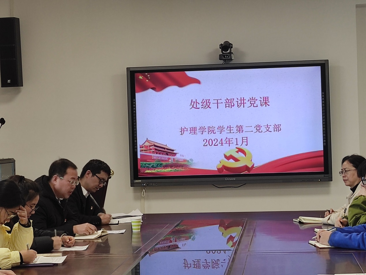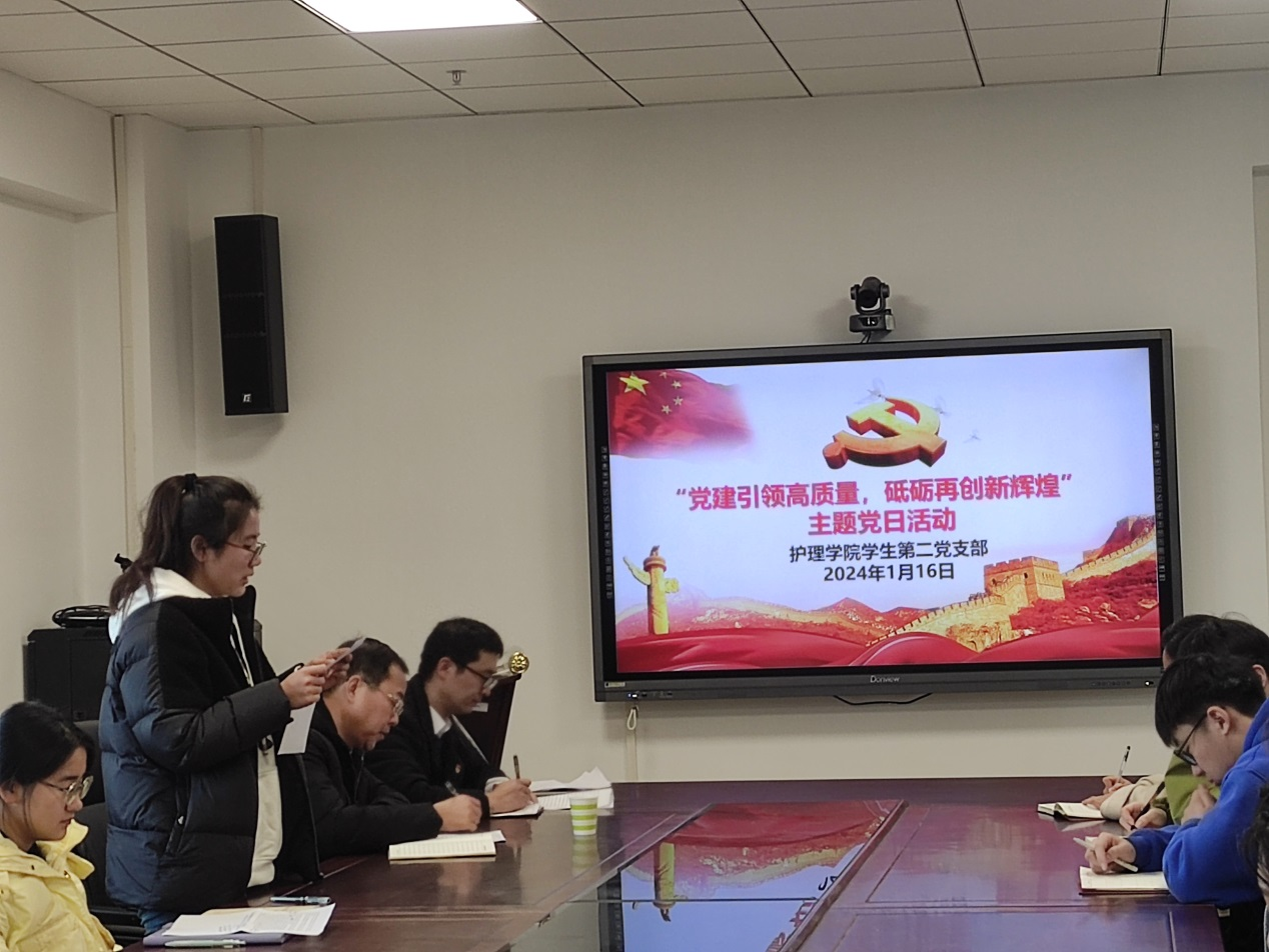 为学习贯彻习近平新时代中国特色社会主义思想和党的二十大精神,认真落实学校管理部门中层党员领导干部联系党支部工作通知要求,扎实推进“双创”“三级联创”党建引领工作,1月16日上午,护理学院学生第二党支部在图书信息楼南楼八楼会议室召开“党建引领高质量 砥砺再创新辉煌”主题党日活动,学校纪委副书记赵文锋应邀参加并开展相关工作调研,护理学院党委副书记王剑英及支部全体党员参加。支部书记黄广主持。