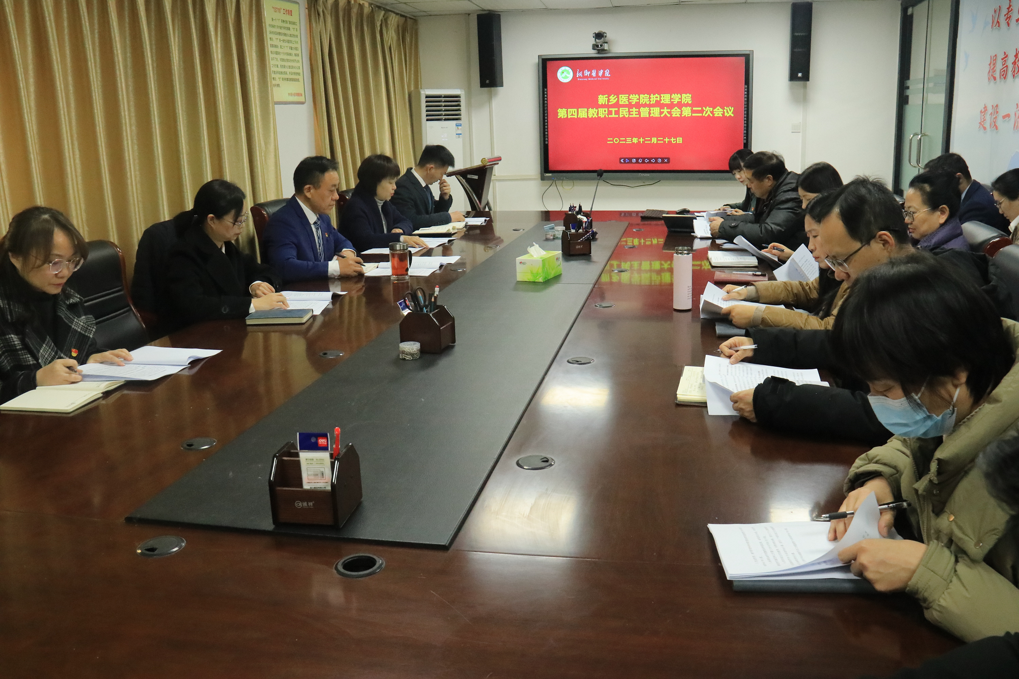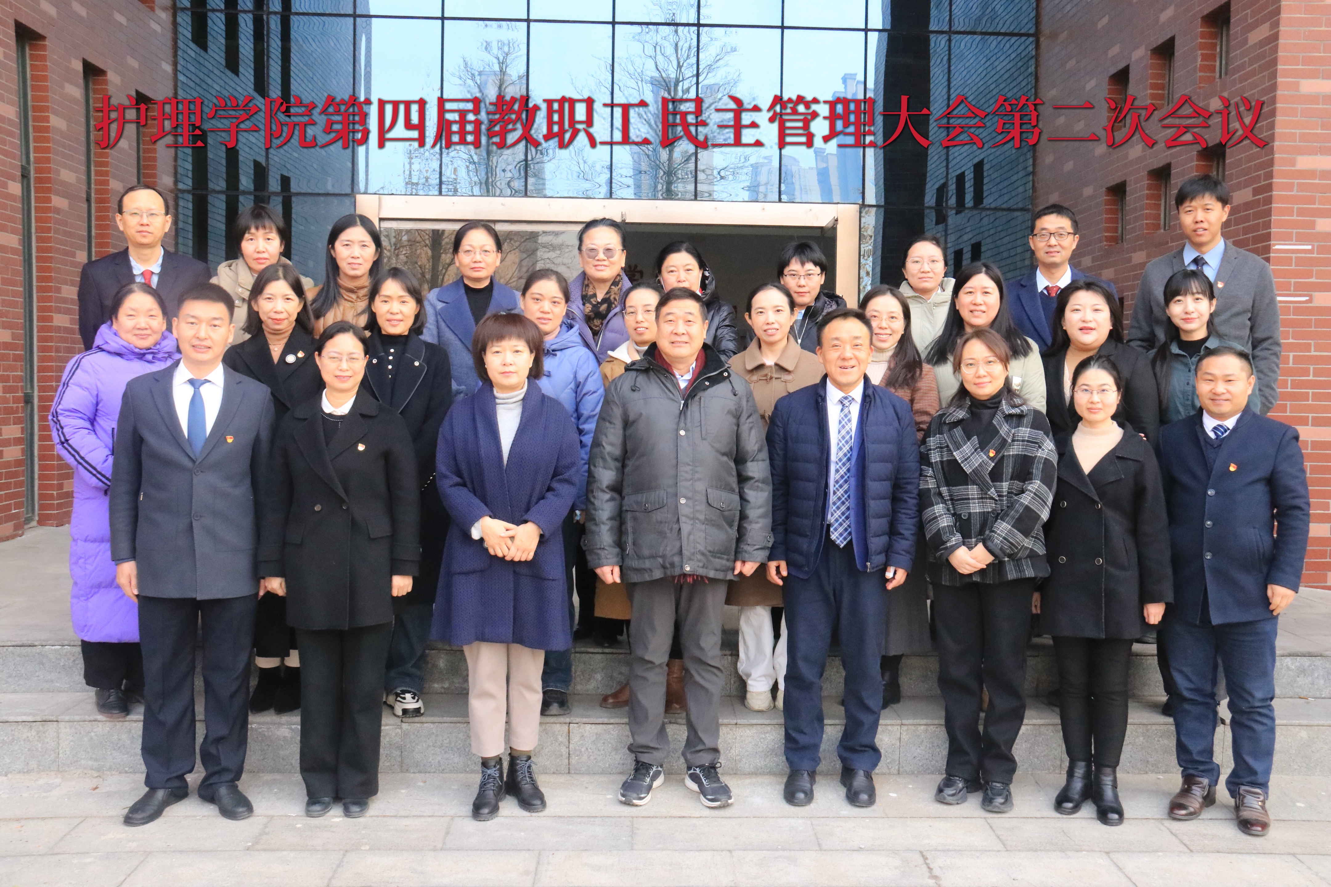 2023年12月28日上午,护理学院四届二次教职工民主管理大会在会议室隆重召开,学院党委书记孙翔、院长王丽娜等领导及全体教职工参加了大会。