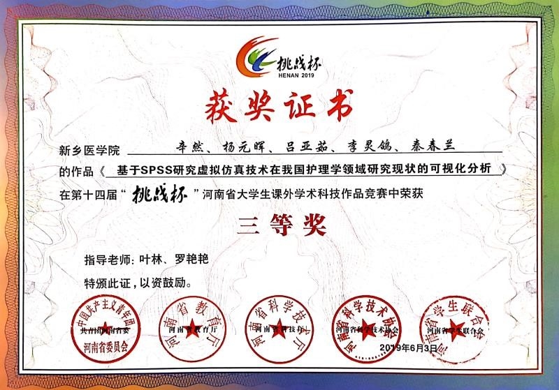 在老师的指导下,辛然同学在2019年第十四届挑战杯河南省大学生课外学术科技作品竞赛中获得三等奖。并发表相关科技论文。