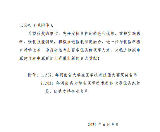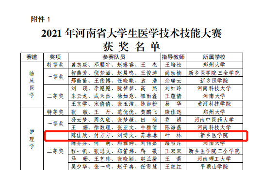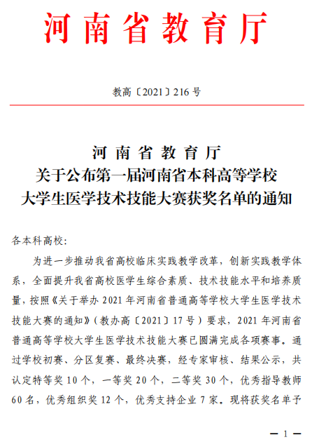 在培训过程中,对训练过程进行有计划的安排,对训练次数、训练时间进行科学分配。针对学生的理论知识进行强化,帮助学生打好基础;针对学生的沟通能力进行强化,让学生学会与患者进行有效沟通。除此之外,技还针对学生的心理素质进行训练。经过数月的团队合作、辛苦付出。指导学生获得第一届河南省本科高等学校大学生医学技术技能大赛一等奖。