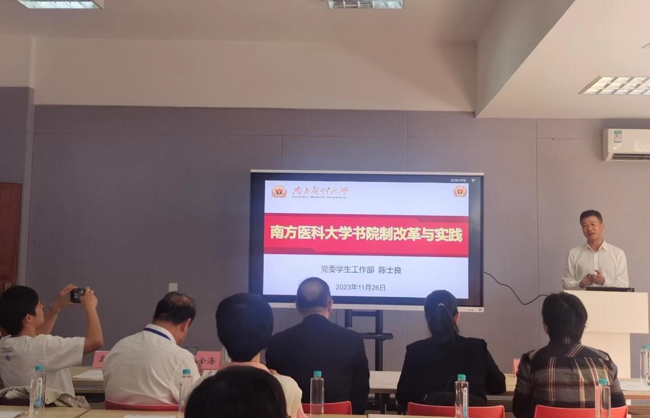 南方医科大学学生工作部部长陈士良以《南方医科大学书院制改革与实践》为题,围绕办学规模、书院制改革实践、建设内容、建设成效等方面介绍书院制下医学生养成教育的经验和特色。