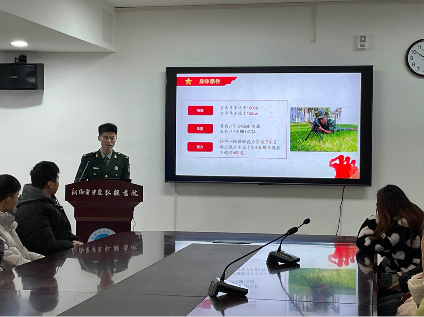 为了激发学生军旅热情,我院于1月3日13时在弘毅书院会议室开展征兵宣传活动,由基础医学院退伍军人王军徽为大家进行宣讲,弘毅书院全体辅导员及学生代表参与这次活动。