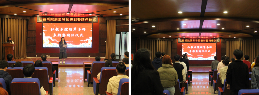为充分发挥朋辈导师的榜样引领作用与互学互助力量,形成团结奋进、昂扬向上的社区育人氛围。 11 月 21 日下午,我院于在第三报告厅隆重举行弘毅书院首届朋辈导师表彰大会暨第二届朋辈导师聘任仪式,书院领导、驻院导师、第一届优秀朋辈导师代表以及第二届全体朋辈导师齐聚一堂,共同见证这一重要时刻。