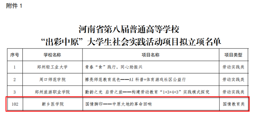 近日,河南省教育厅公布了《关于河南省普通高等学校“出彩中原”大学生社会实践活动项目立项、结项及等次评定结果名单的公示》,我院申报的《国情脚印——中原大地的革命回响》项目获批立项。