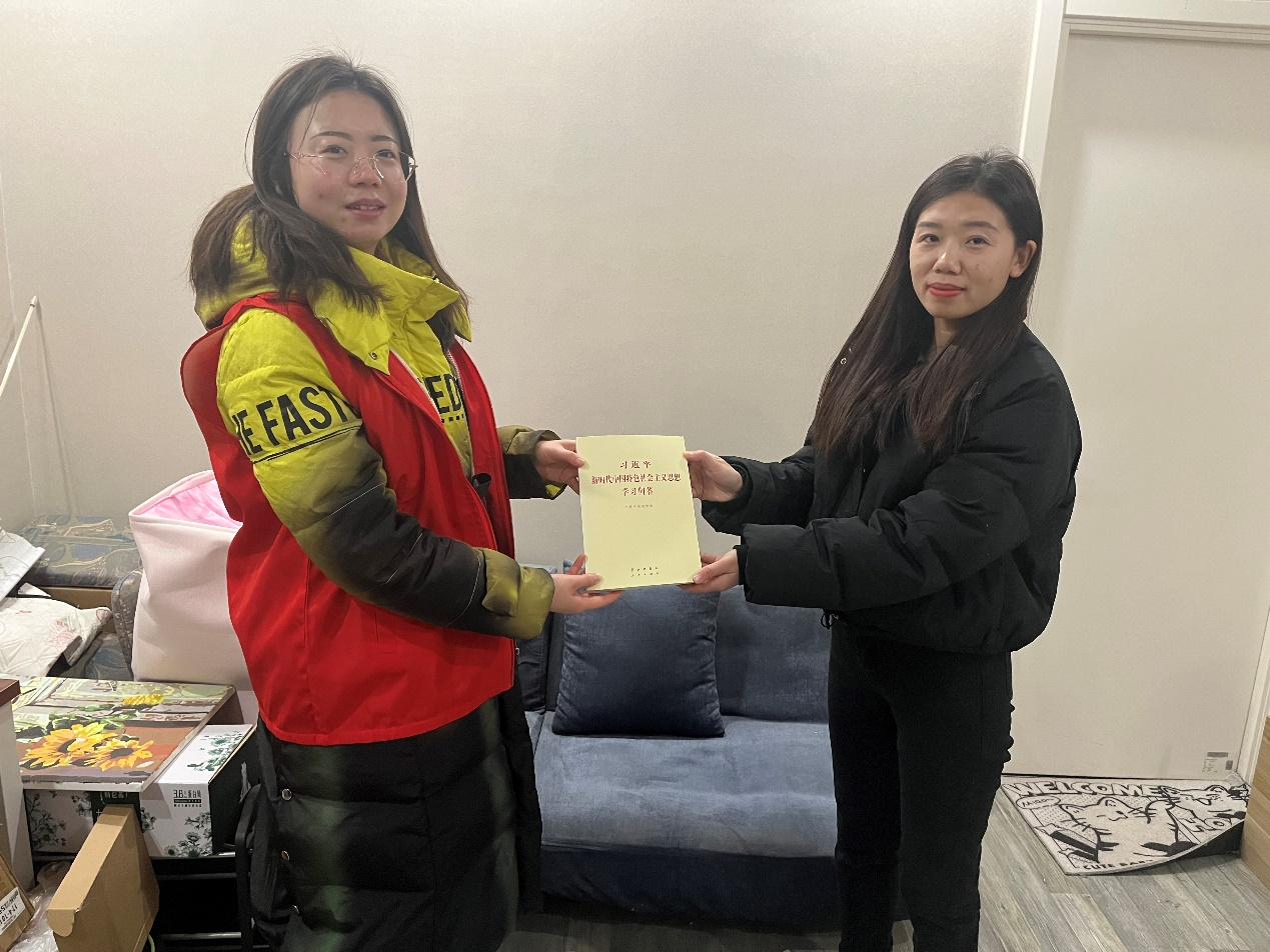 1月12日,弘毅书院宣讲员刘晨采用点对点的宣讲方式走进社区居民家中,宣讲习近平新时代中国特色社会主义思想和党的二十大精神。宣讲员每到一处,还会为居民赠送相关理论书籍。
