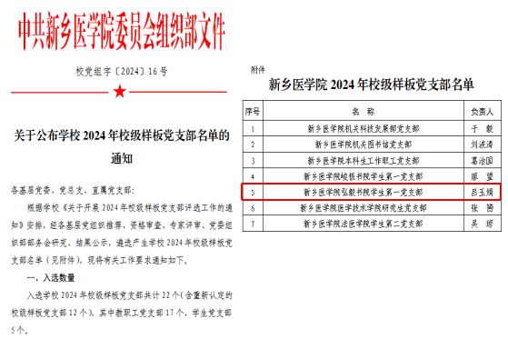 近日,学校发布《关于公布学校2024年校级样板党支部名单的通知》,经各基层党组织推荐、资格审查、专家评审、党委组织部部务会研究、结果公示等环节,我院学生第一党支部获评2024年校级样板党支部。