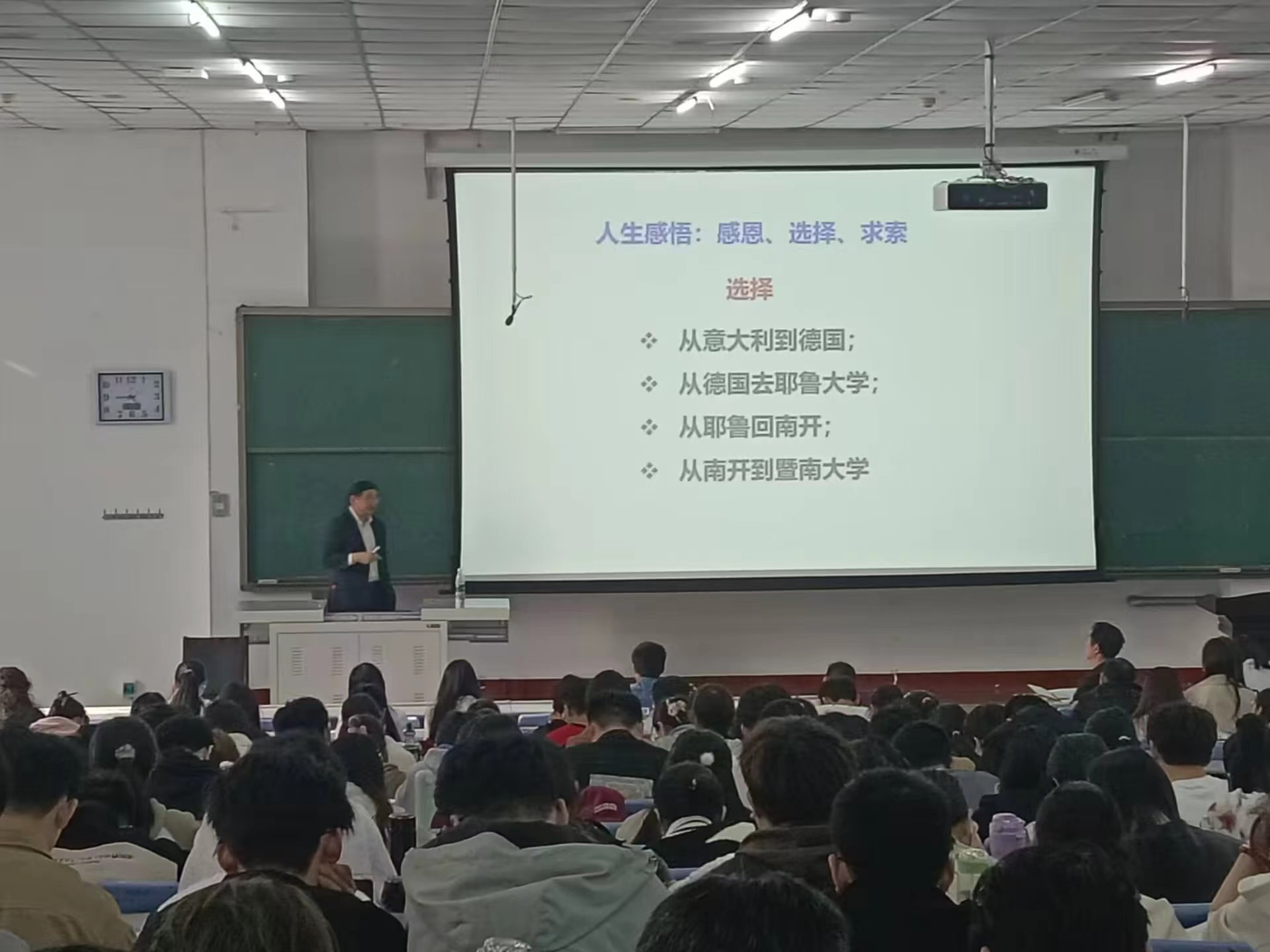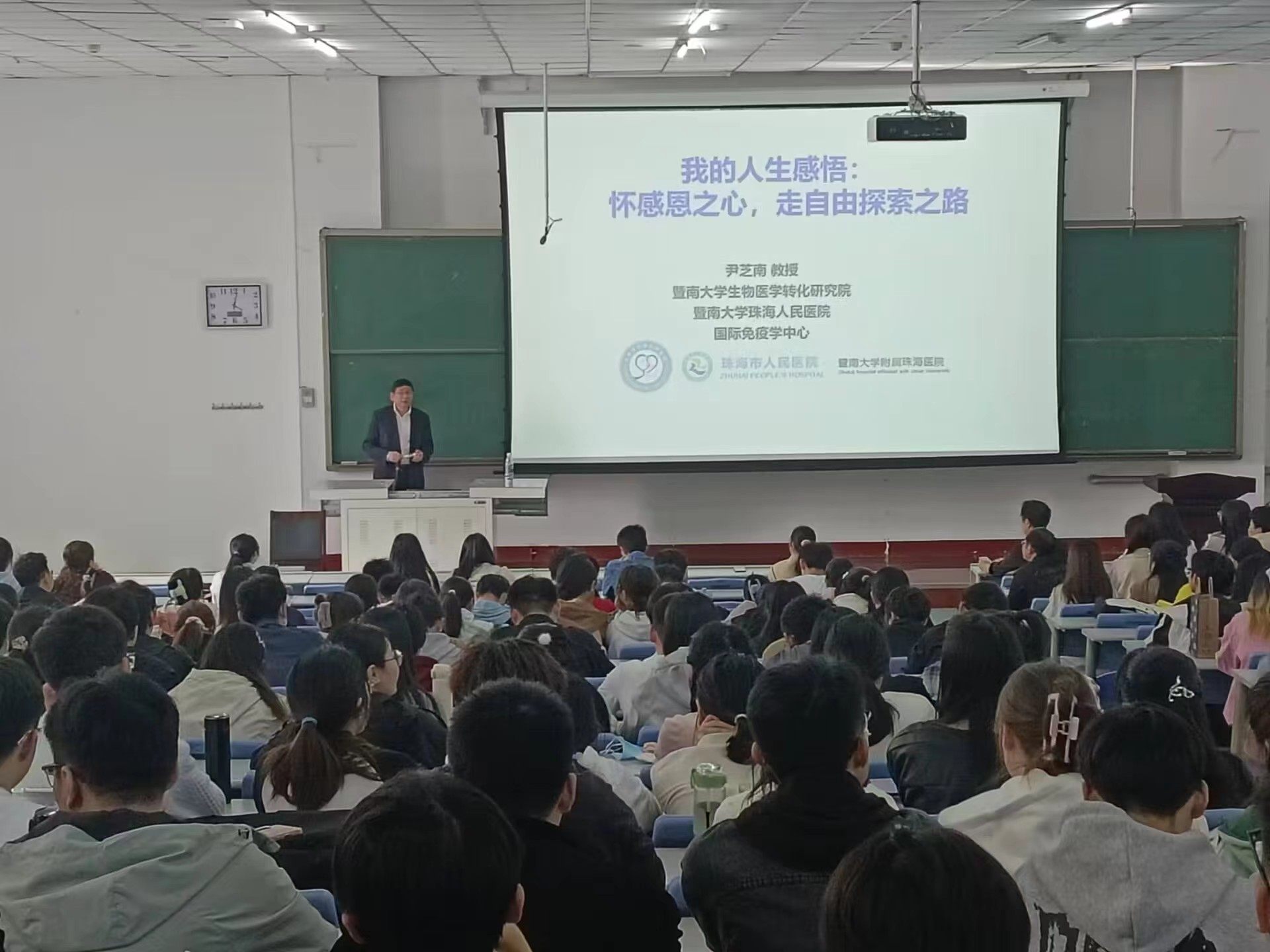 本次学术报告由国家杰出青年基金获得者、教育部“长江学者”特聘教授、暨南大学生物医学转化研究院院长、耶鲁大学医学院客座教授尹芝南教授主讲。尹芝南教授从自身的经历入手,从人生旅途、人生感悟、人生建议、人生坐标四个方面分享自己在科研求学途中所遇到的良师益友和珍贵的机会,用自身的科研经历激励同学们要勇于创新,迈向新的可能,并鼓励同学们学有所成时要用所学知识主动帮助别人,回馈社会,使同学们明白了感恩、选择、求索和奉献的重要性。