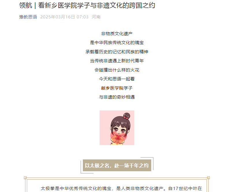 太极拳是中华优秀传统文化的瑰宝,是人类非物质文化遗产。我院从医学检验技术专业、医学影像技术、生物技术、智能影像工程、应用心理学等13个专业学生中遴选出455名学生,组成“太极拳”文化展演矩阵,经过精心策划、反复练习,此次太极拳团体操展演动作流畅自然、规范统一、柔中带刚,弘扬我国优秀传统文化的同时也彰显出弘毅学子认真求实,坚韧不拔,团结向上的精神风貌,展演活动被豫教思语媒体报道。