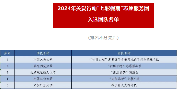 近日,团中央青年志愿者行动指导中心、中国青年志愿者协会秘书处联合发布了《关于遴选2024年关爱行动“七彩假期”志愿服务团的公告》,我院“阳光彩虹桥”、“微光星柒六”志愿队成功入选。