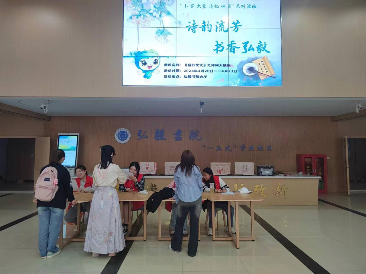 诗词之美,千古之绝,唐诗宋词,中华精髓。自古以来,诗词便是文人墨客抒发情感、表达思想的重要载体,它承载了中华民族精神文明的精髓。为营造全民读书、终身学习的良好氛围,4月20日下午,我院举办“诗韵流芳,书香弘毅——诗词大挑战”通识实践活动。